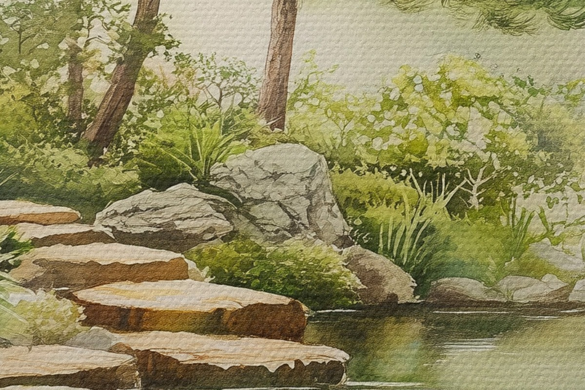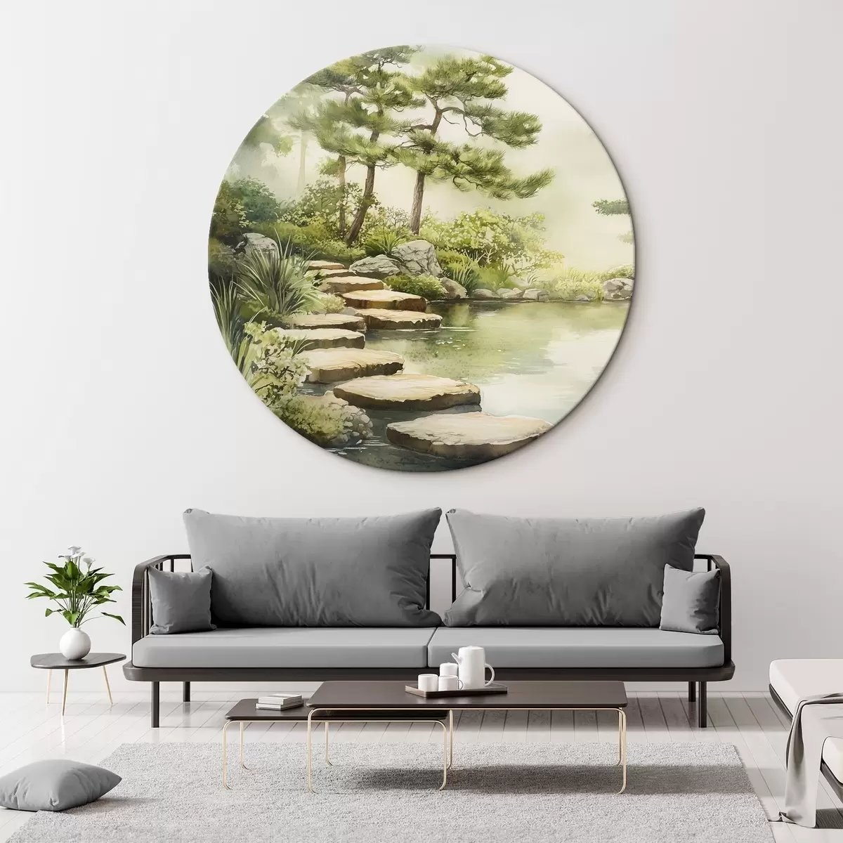 Ronde schilderijen Oosterse tuin met meer en bomen, natuur, aquarelstijl Nr r44313