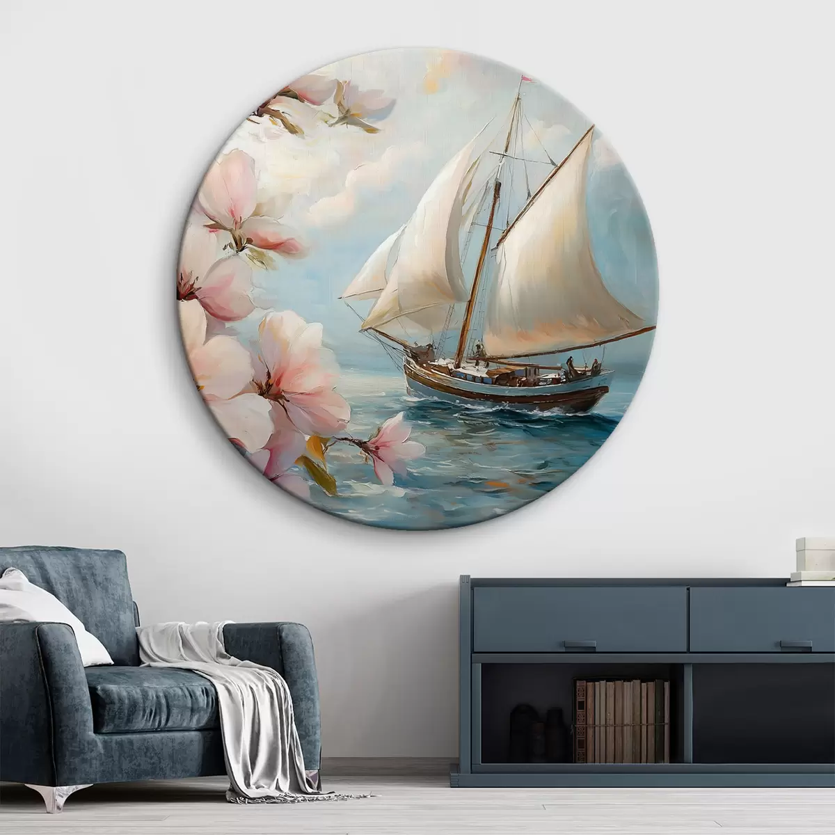 Ronde schilderijen Boot op zee en grote bloemen r44330