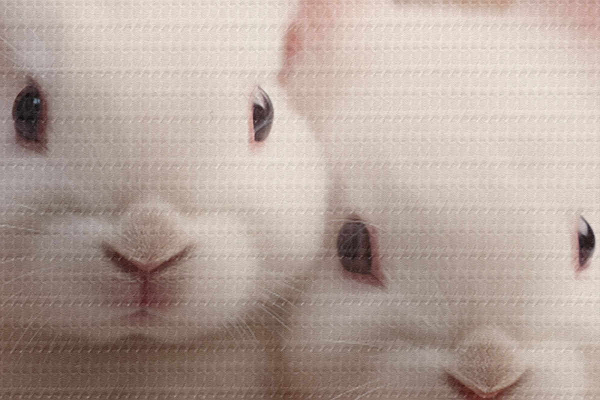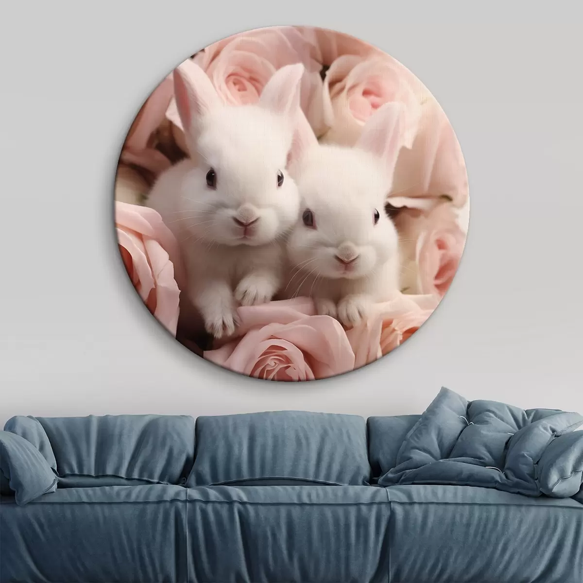 Ronde schilderijen Twee witte konijnen in tere rozenbloemen Nr r44380