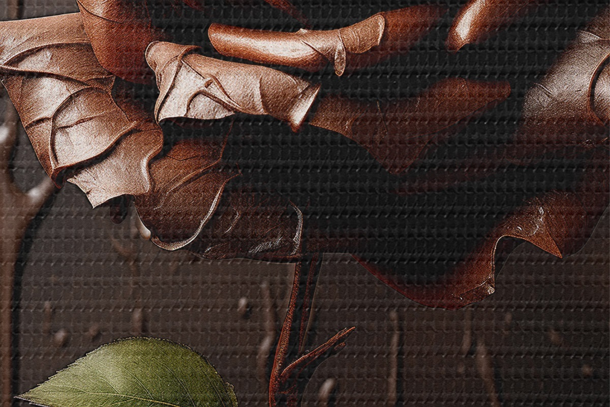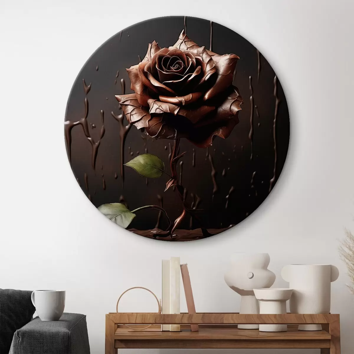 Ronde schilderijen Bruine roos op een donkere achtergrond met chocolade spetters r44381