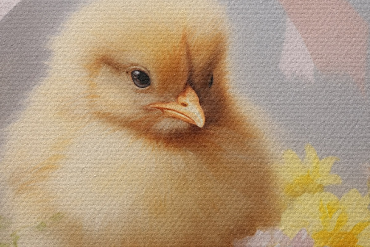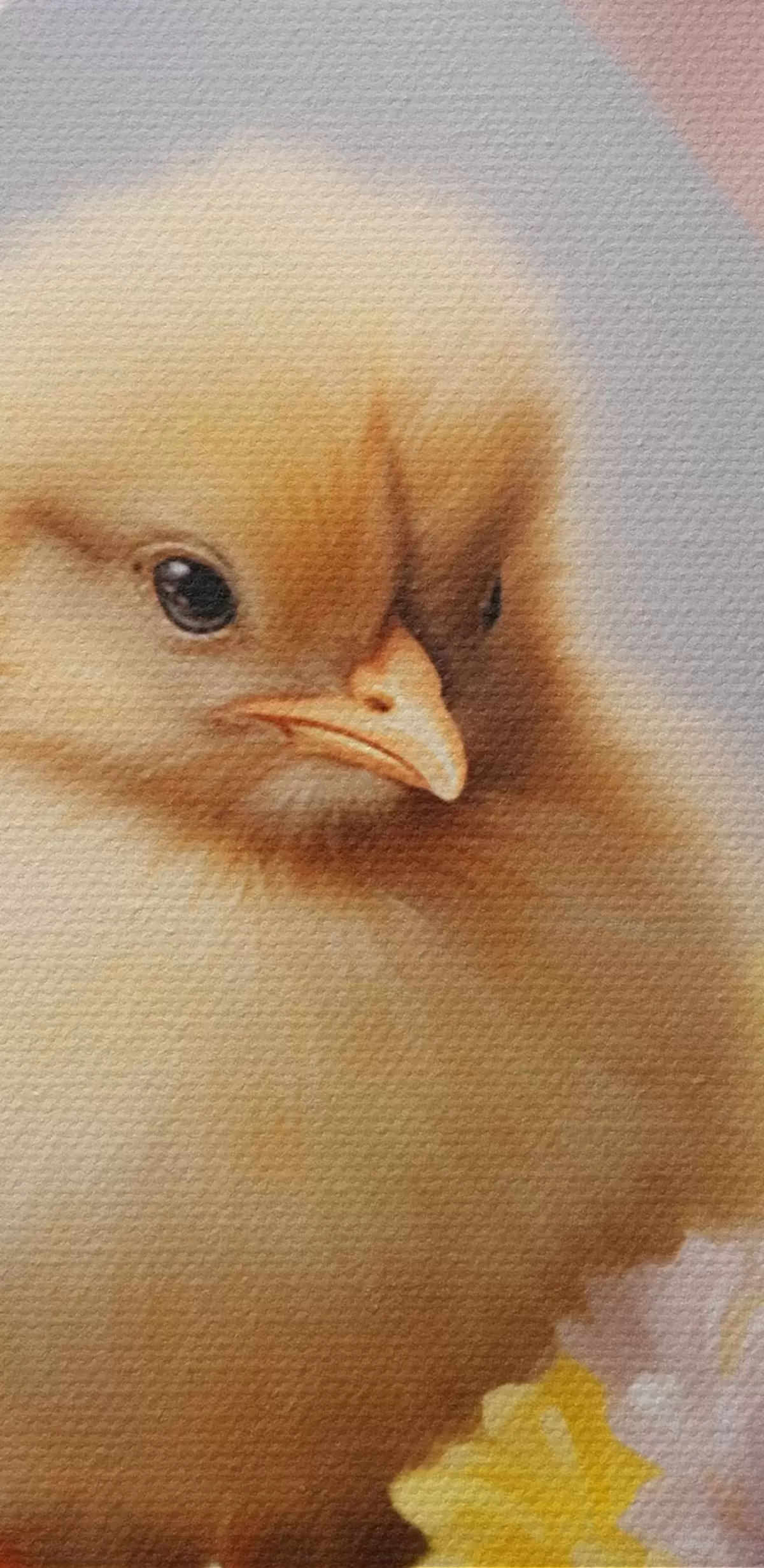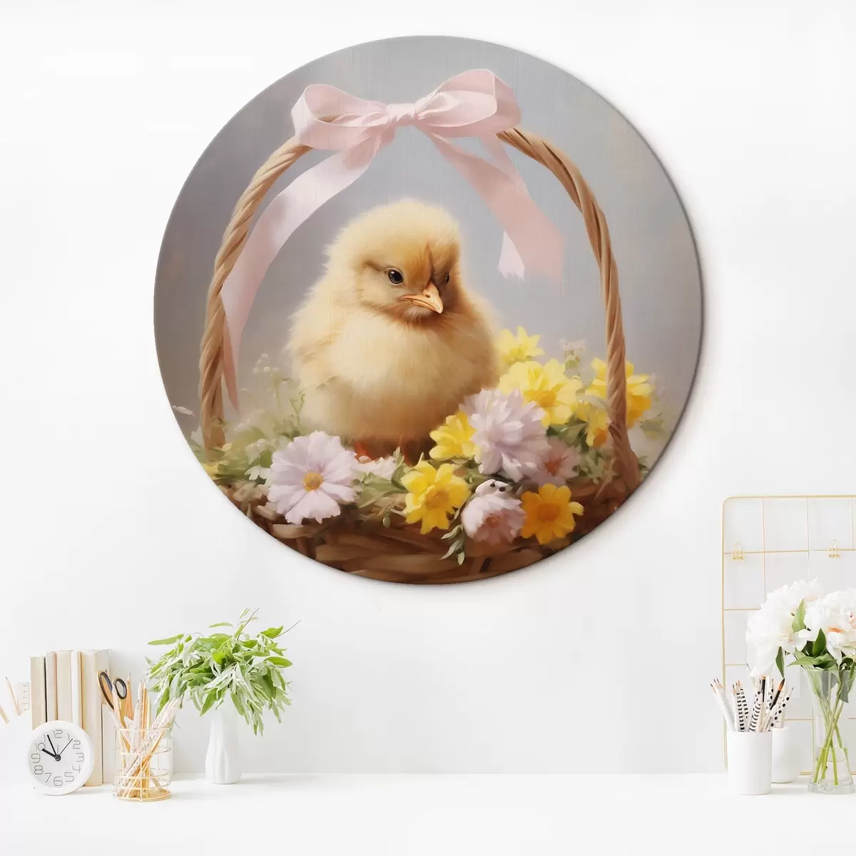 Ronde schilderijen Geel kuiken in een mand met wilde bloemen Nr r44384