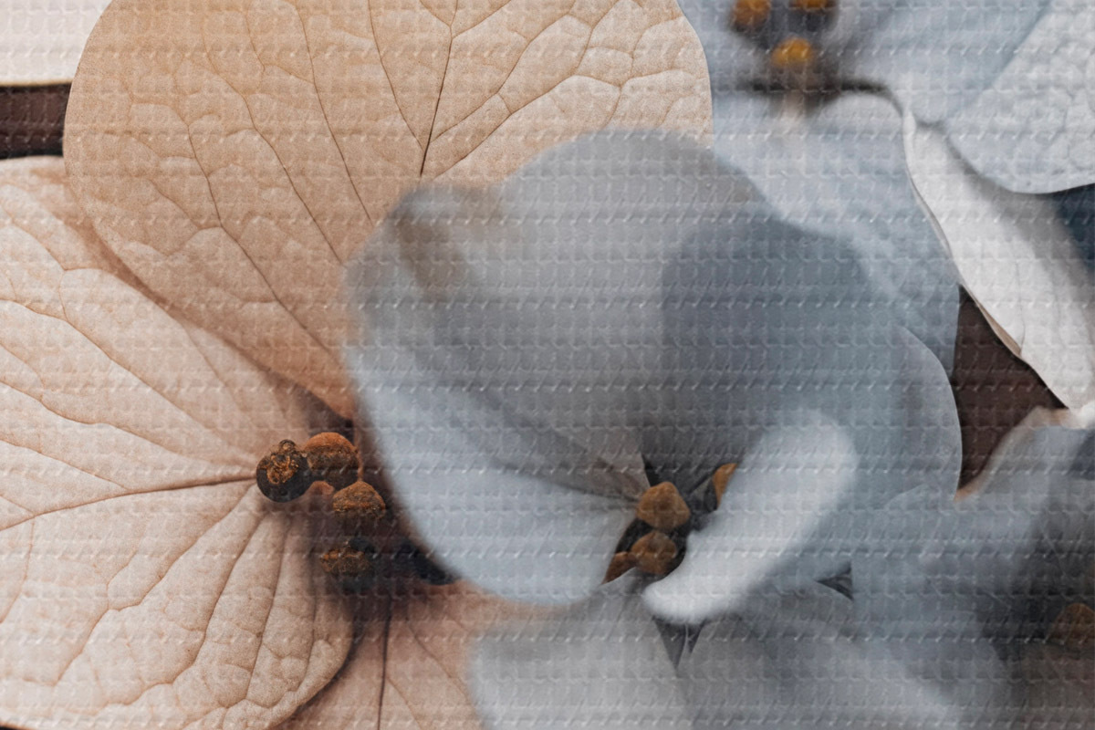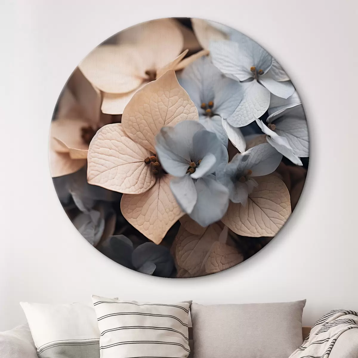 Ronde schilderijen Hortensiabloemen, lichtblauwe en beige bloemblaadjes, met gedetailleerde texturen, elegant bloemstuk Nr r44394