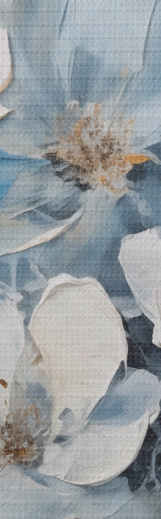 Ronde schilderijen Witte bloemen met blauwe bladeren, op een lichtbeige achtergrond, met zichtbare penseelstreken r44395