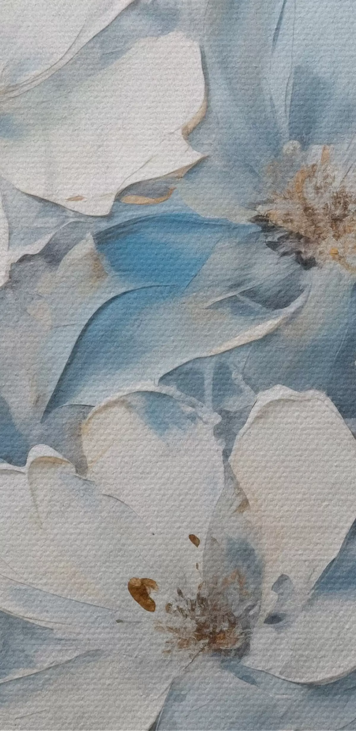 Ronde schilderijen Witte bloemen met blauwe bladeren, op een lichtbeige achtergrond, met zichtbare penseelstreken Nr r44395