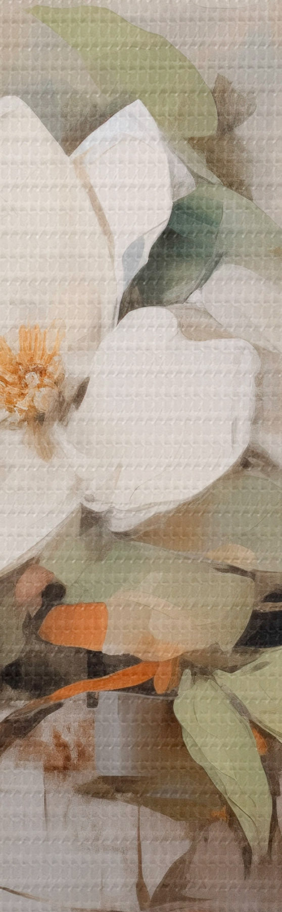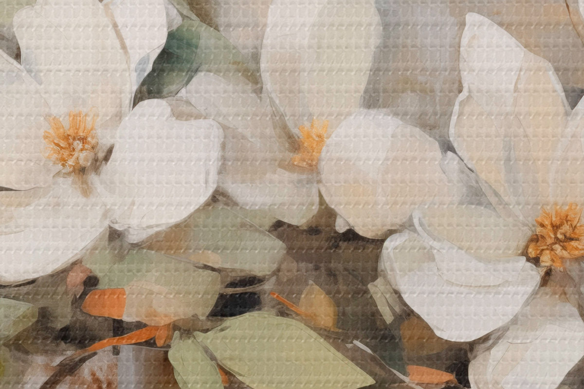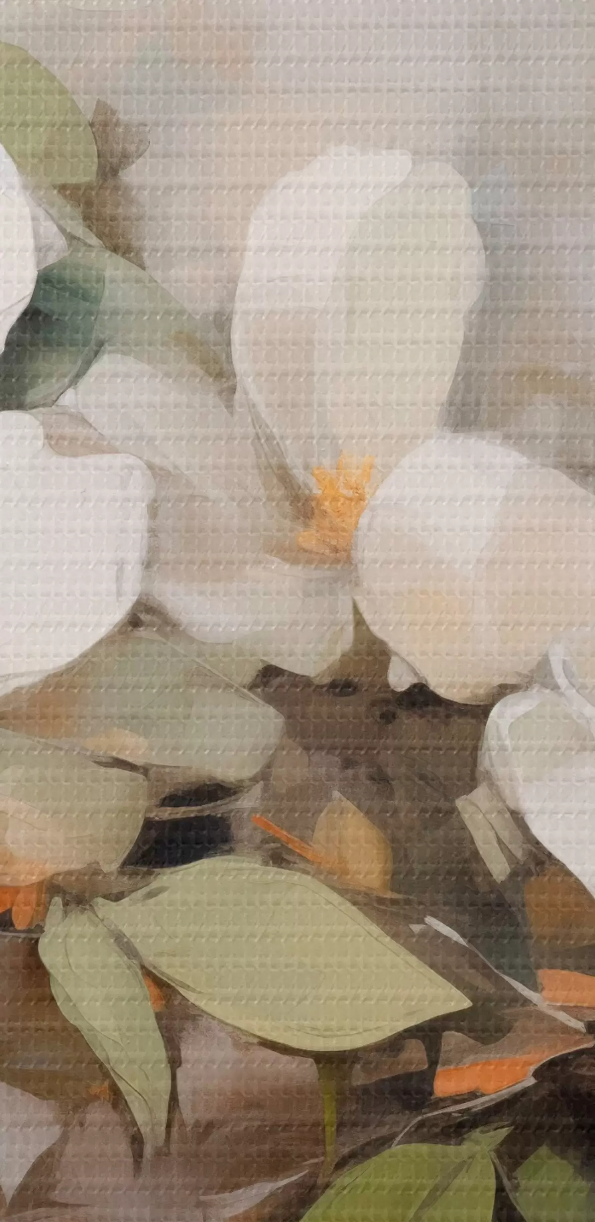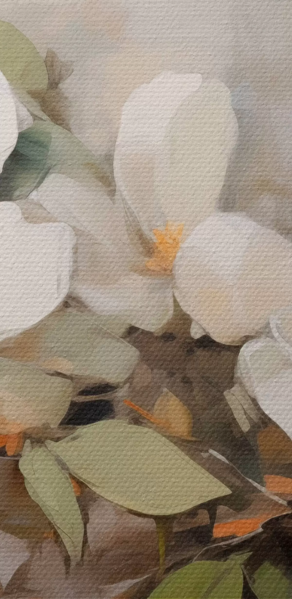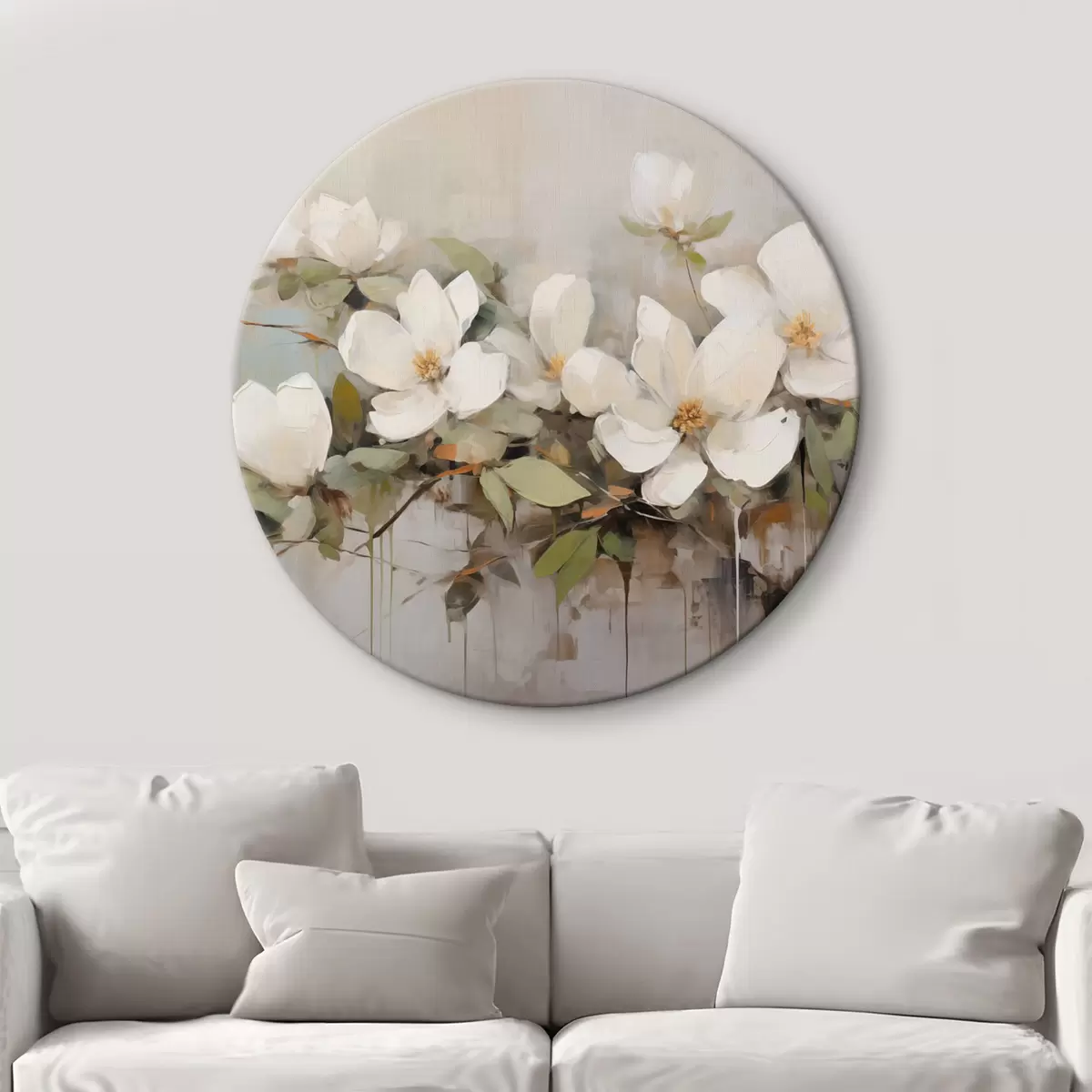 Ronde schilderijen Witte magnolia bloemen met groene bladeren op een tak, zachte penseelstreken, gedempte kleuren Nr r44404