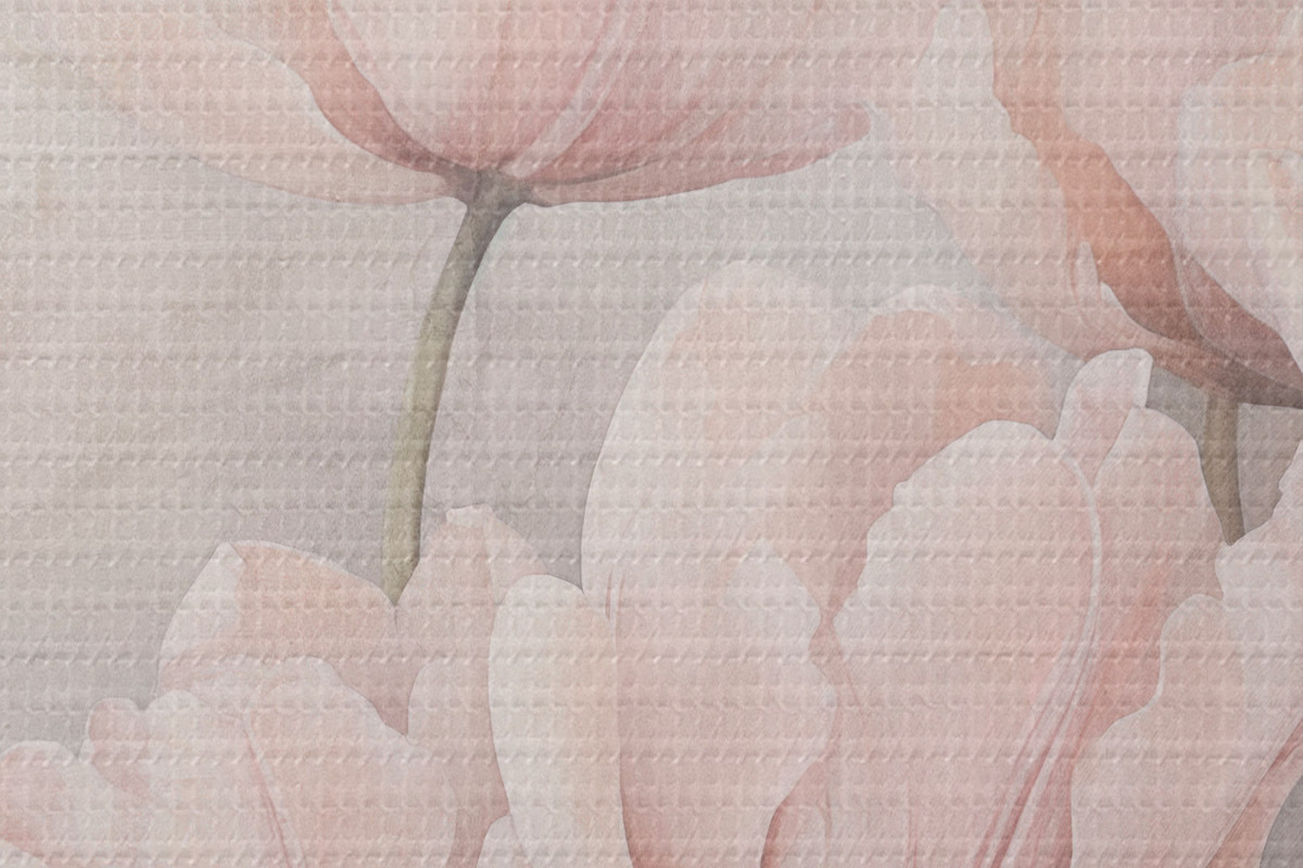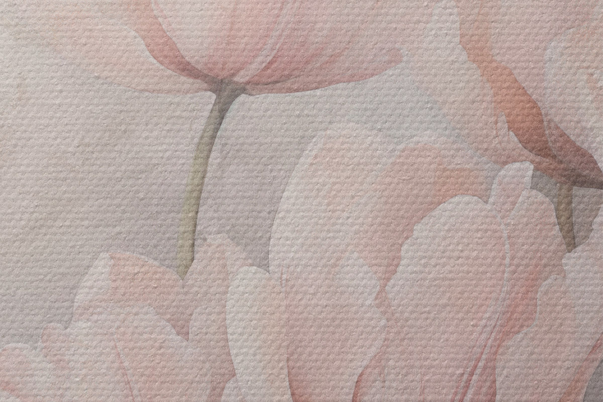 Ronde schilderijen Vintage roze tulpen met lange stelen, zachte gedempte kleuren, lichtgrijze achtergrond r44407