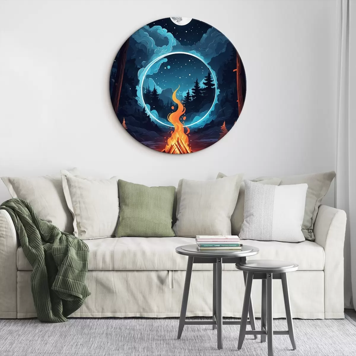Ronde schilderijen Vreugdevuur in nachtelijk bos Nr r44436