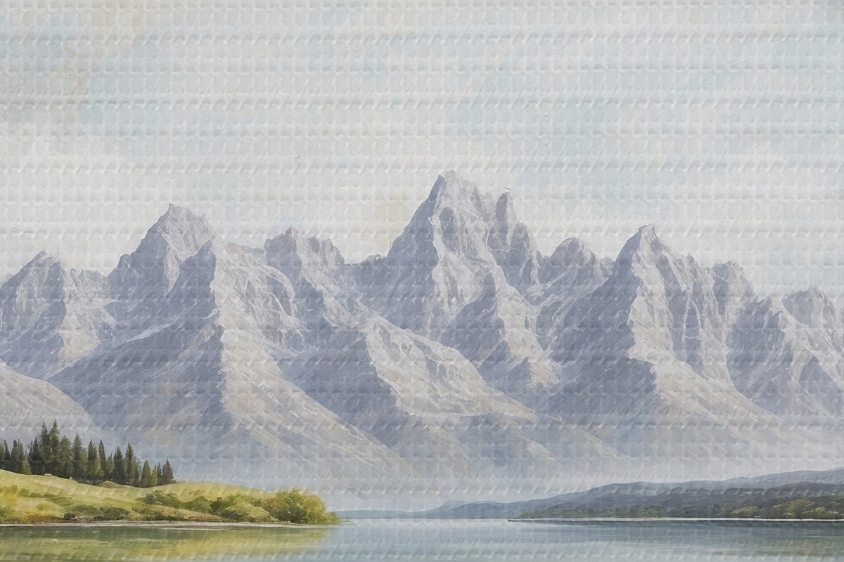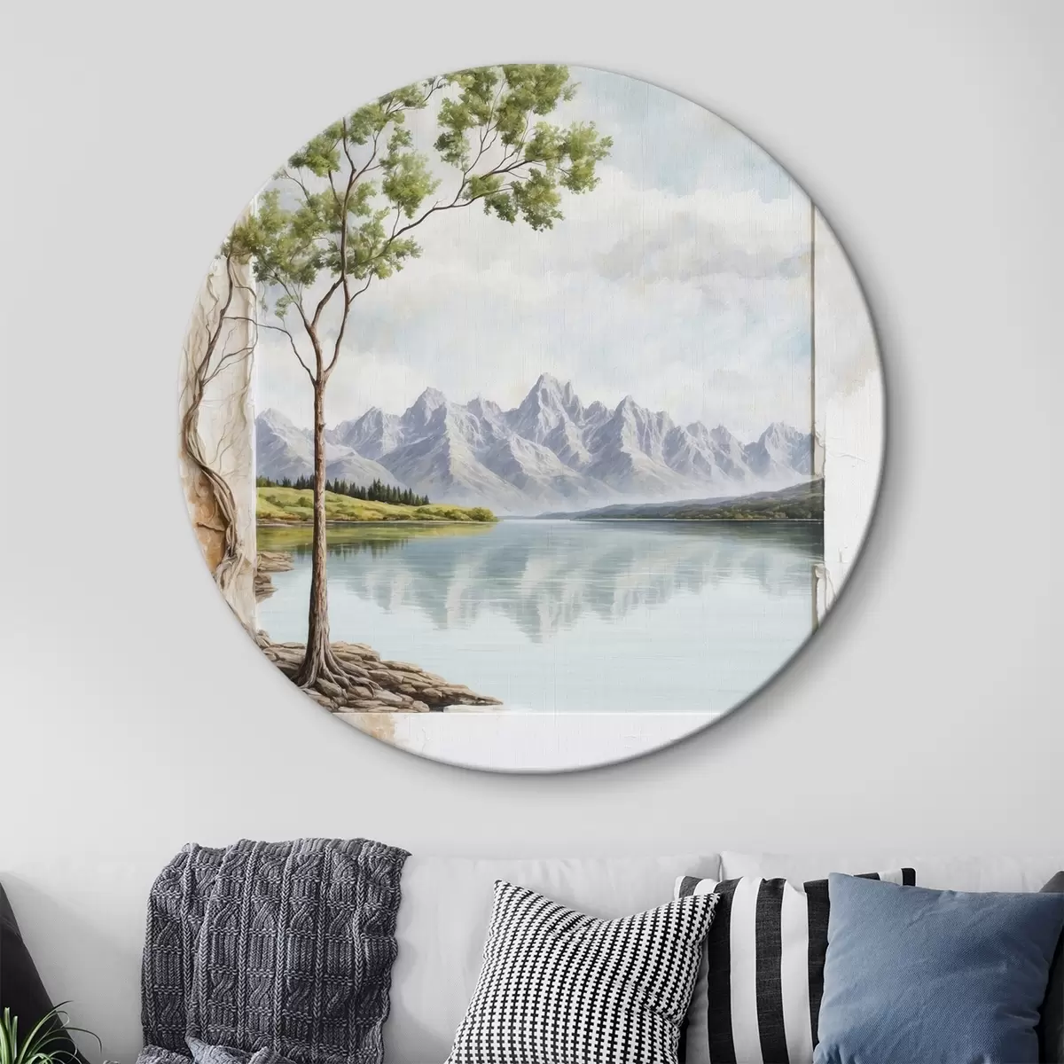 Ronde schilderijen Uitzicht op meer en besneeuwde bergen in frame Nr r44458