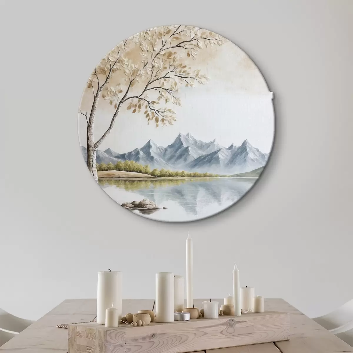 Ronde schilderijen Boom op meer en besneeuwde bergen achtergrond Nr r44459