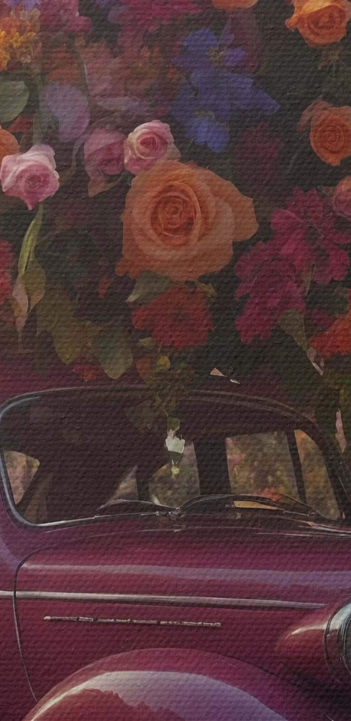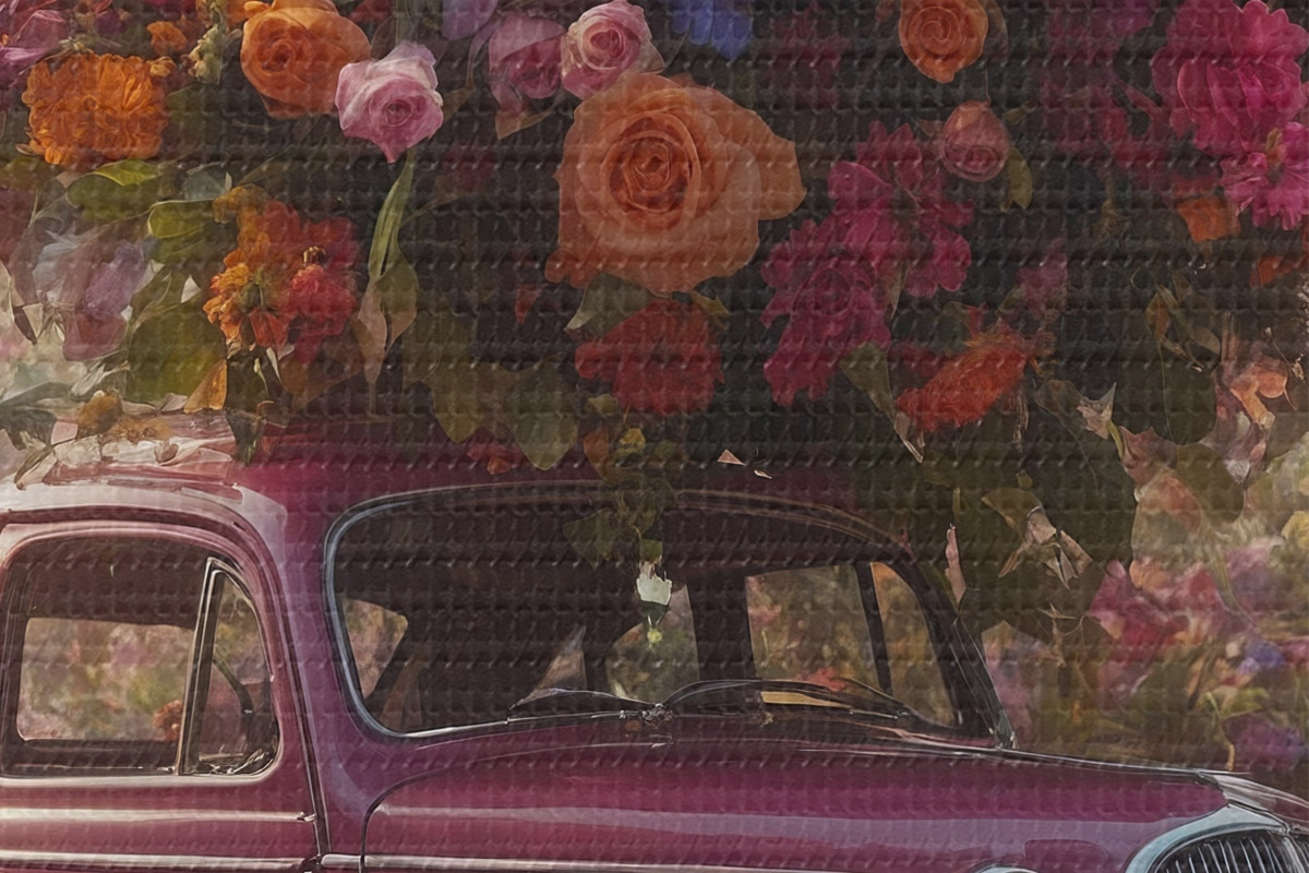 Ronde schilderijen Retro auto en een enorme bos bloemen r44471