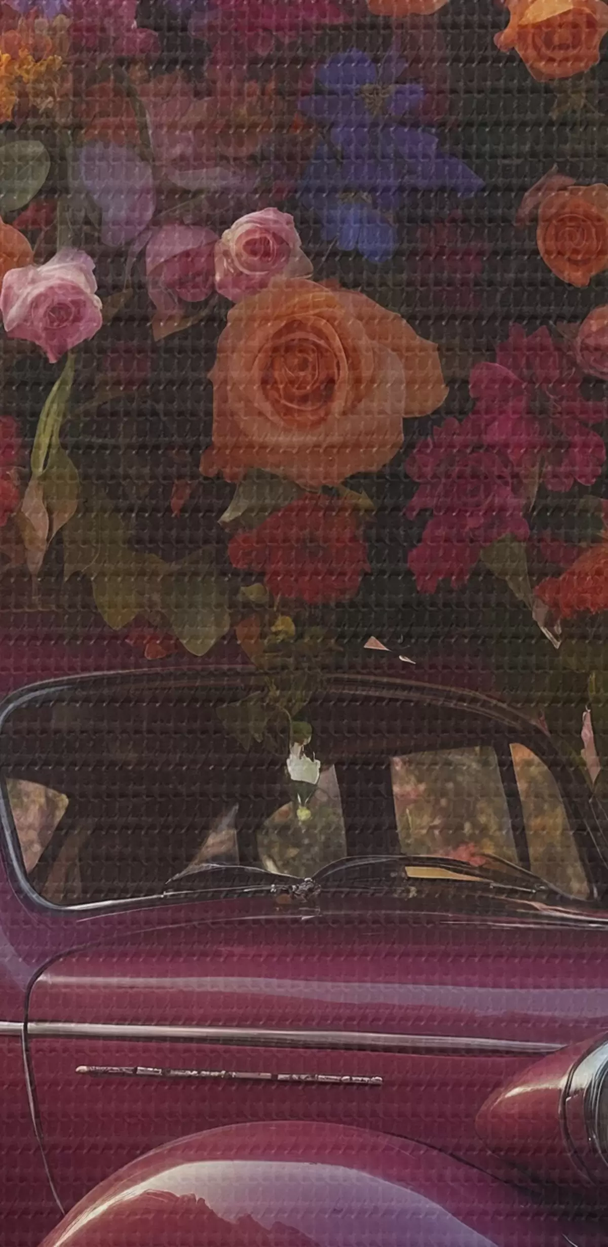Ronde schilderijen Retro auto en een enorme bos bloemen Nr r44471