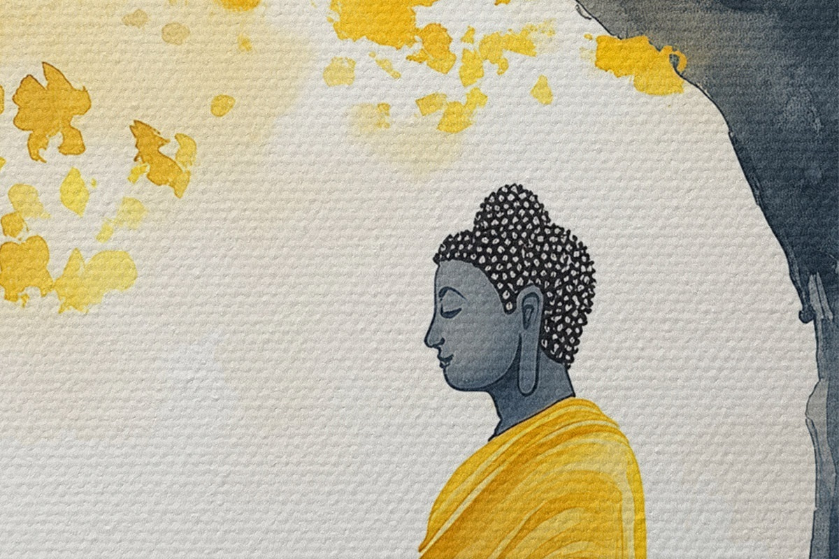 Ronde schilderijen Mediterende Boeddha onder de boom, gele en grijze kleuren r44509