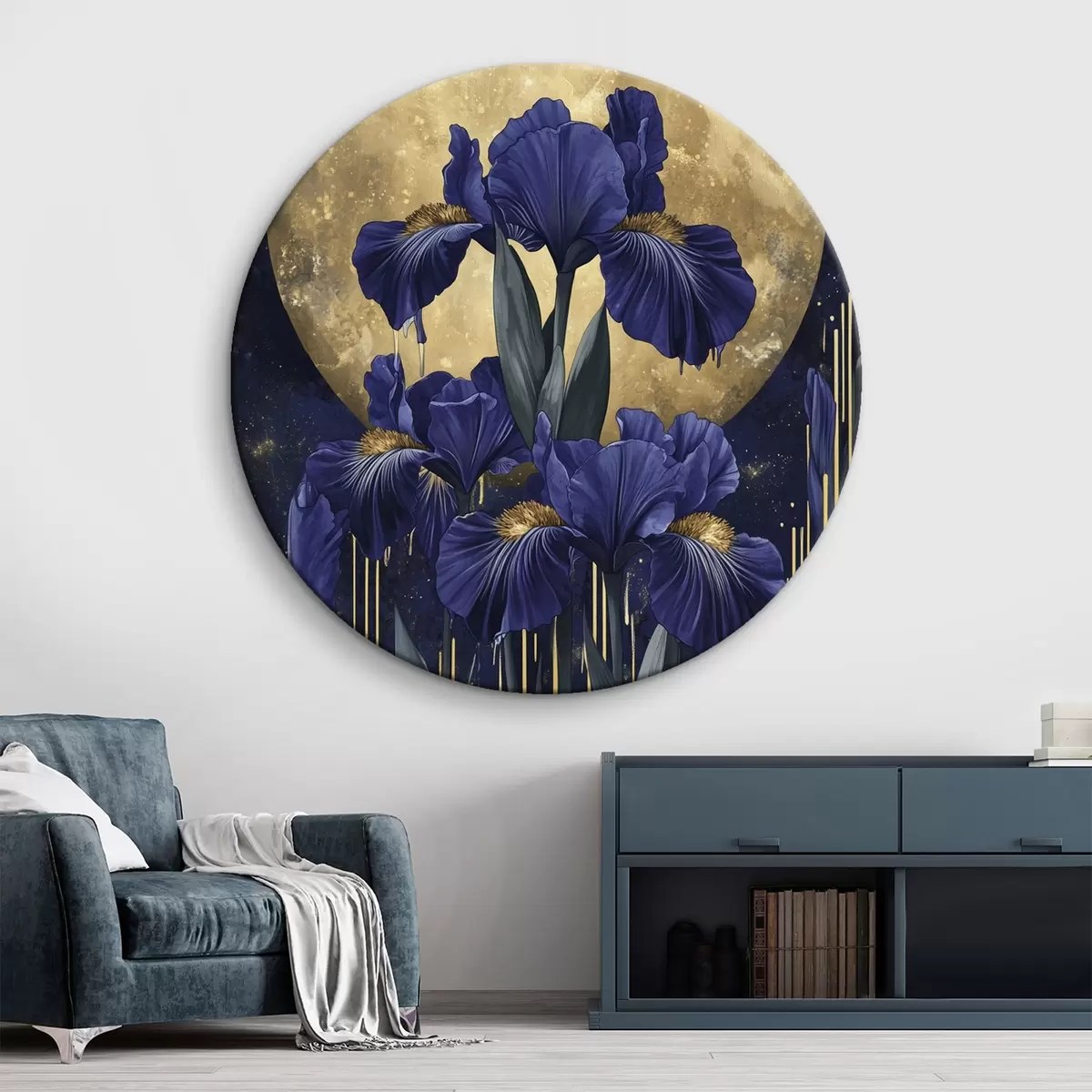 Ronde schilderijen Irisbloemen, stralende maan, nachtelijke hemel, blauwe kleuren Nr r44510