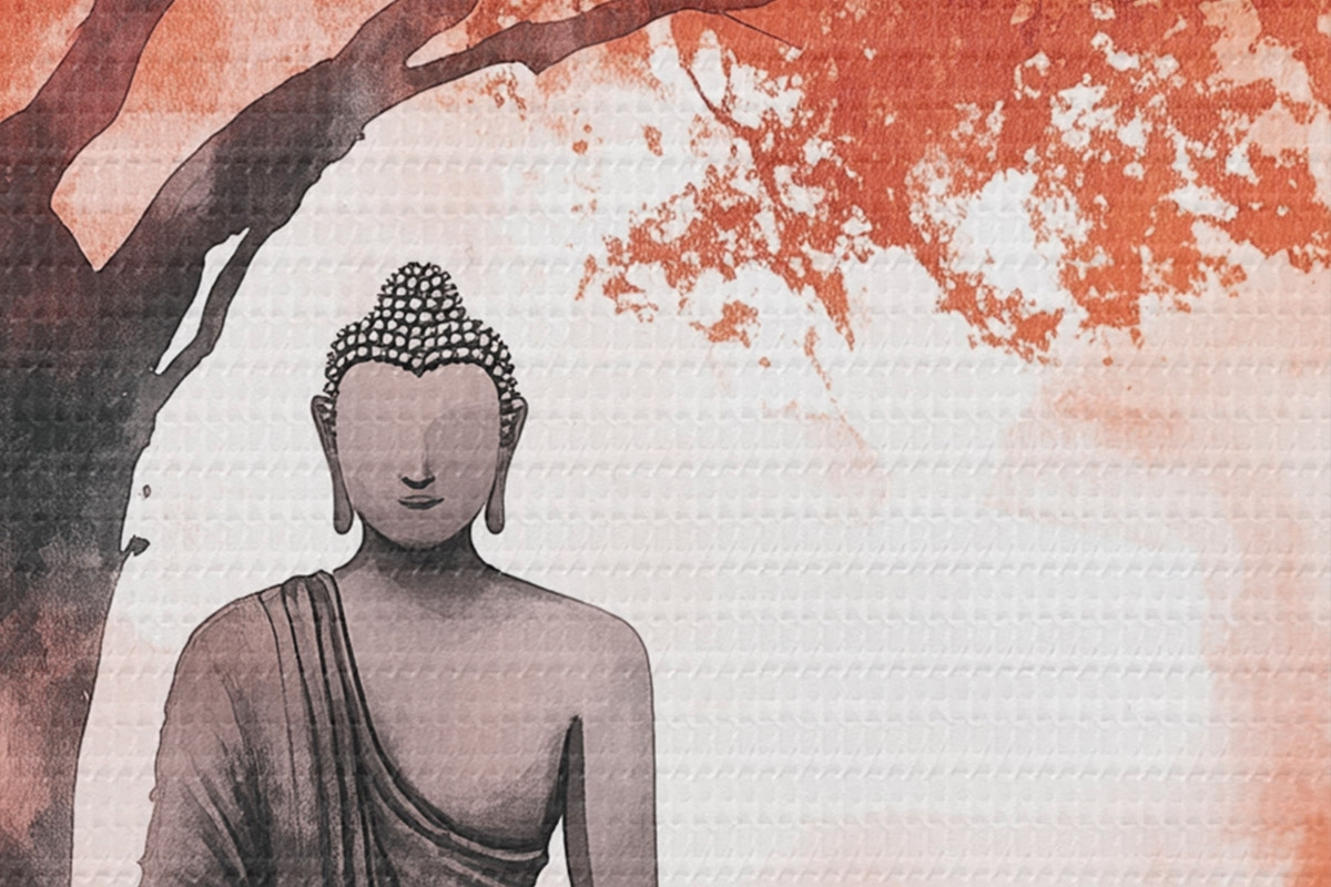 Ronde schilderijen Boeddha zittend onder de boom, meditatie, spiritueel, oranje kleuren r44512