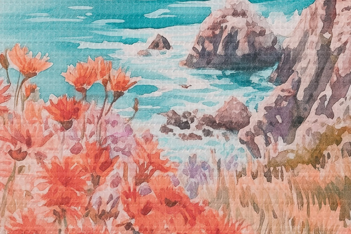 Ronde schilderijen Portugal oceaan kust op de zonsondergang, weide bloemen r44612