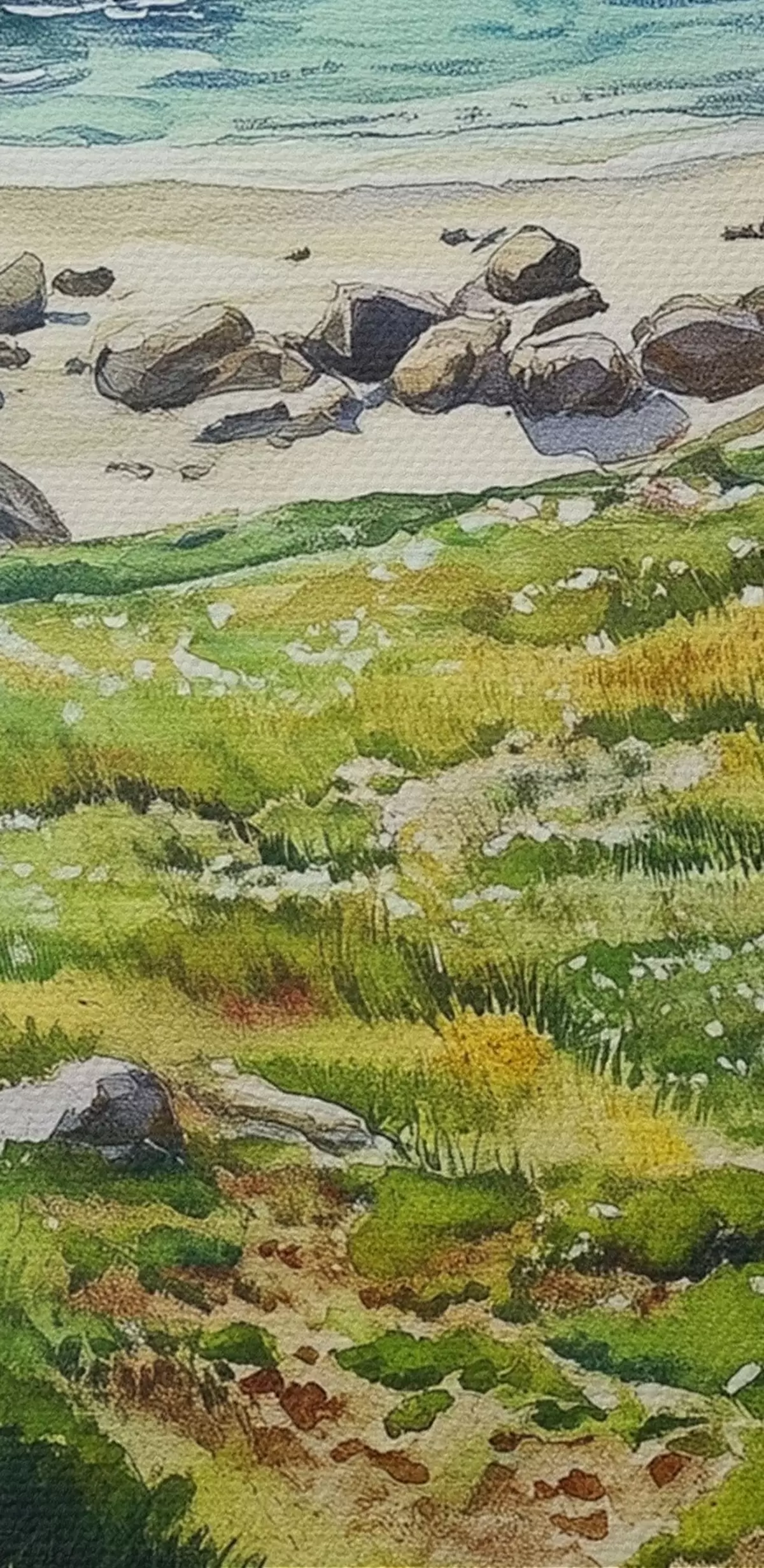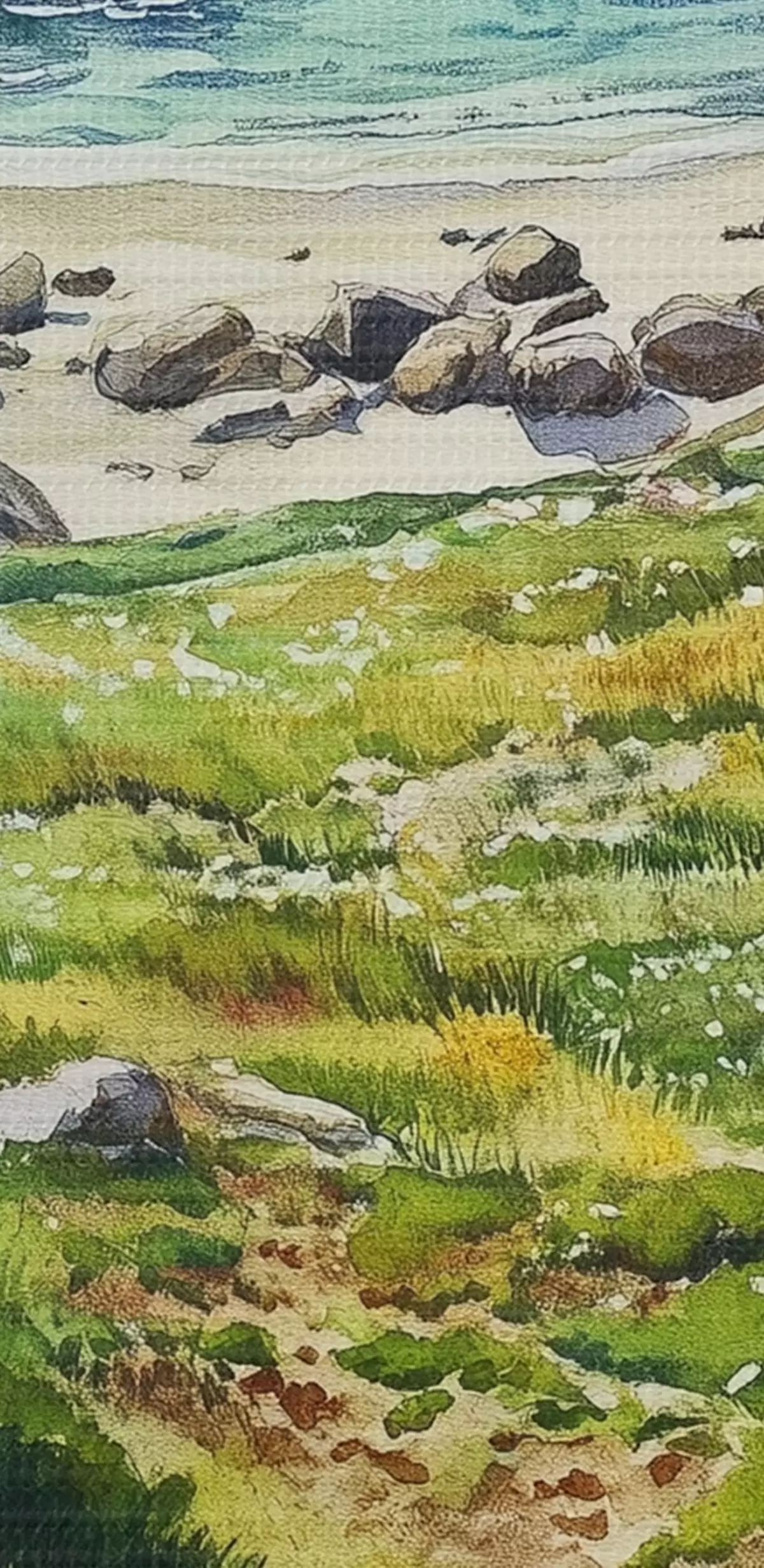 Ronde schilderijen Zeekust met rotsen en groen gras, aquarel stijl, zomer Nr r44616