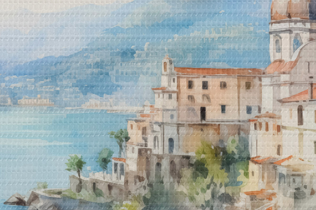 Ronde schilderijen Stad aan zee imitatie van aquarel r44635