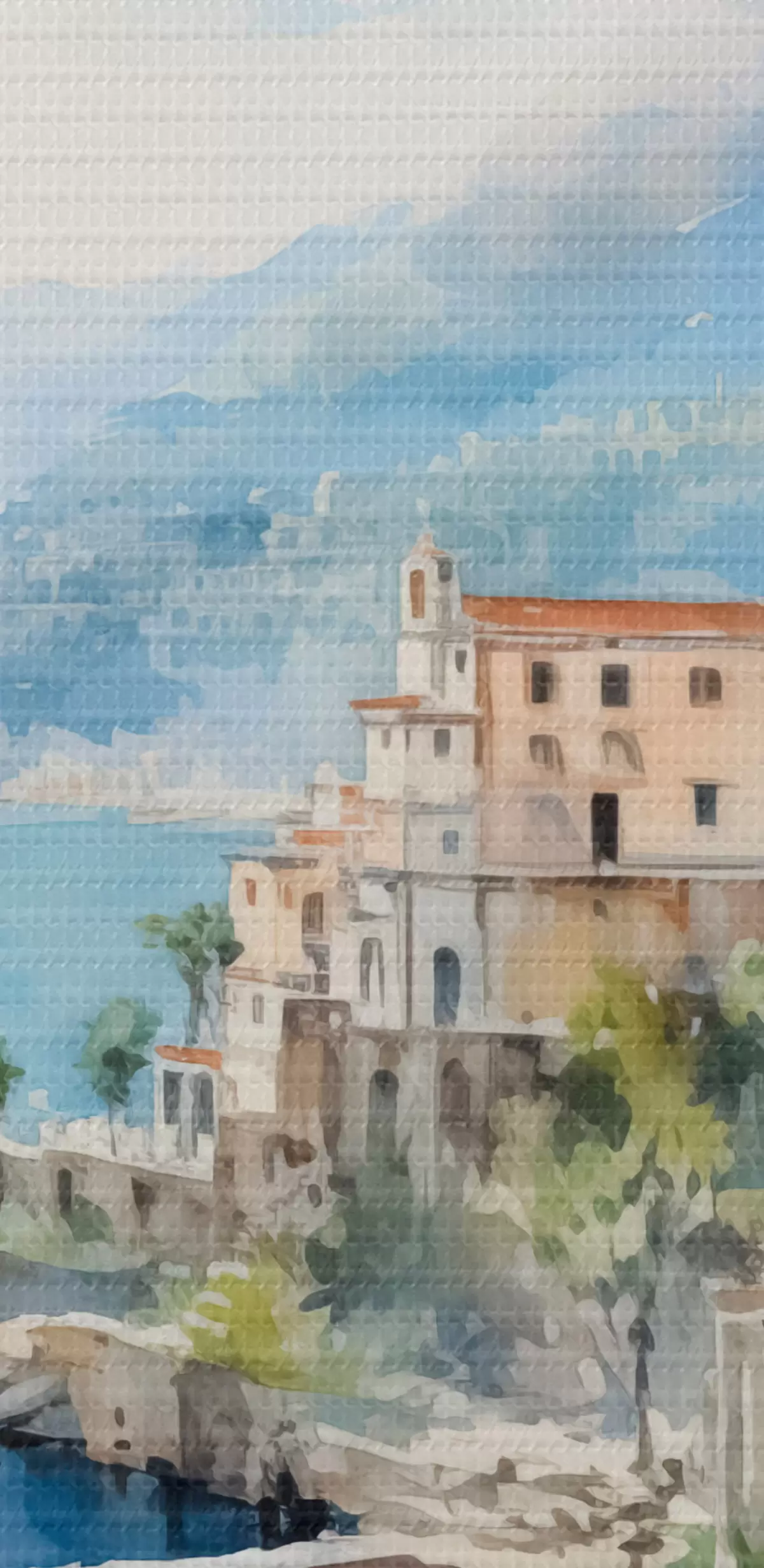 Ronde schilderijen Stad aan zee imitatie van aquarel Nr r44635