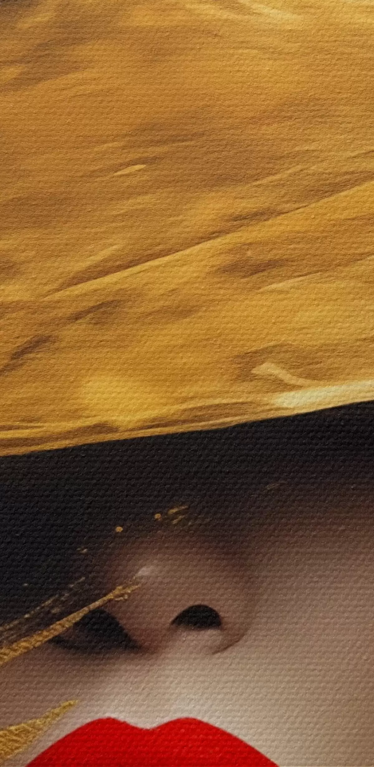 Ronde schilderijen Vrouwengezicht met rode lippenstift onder brede hoed Nr r44691