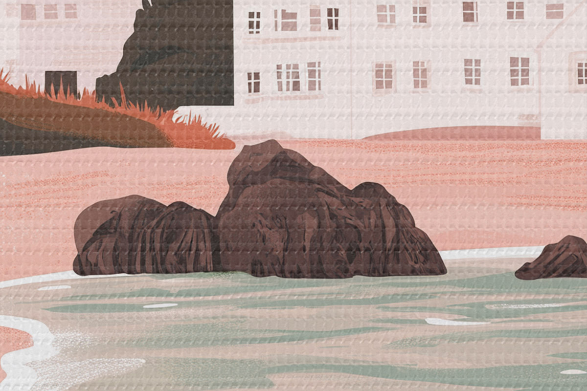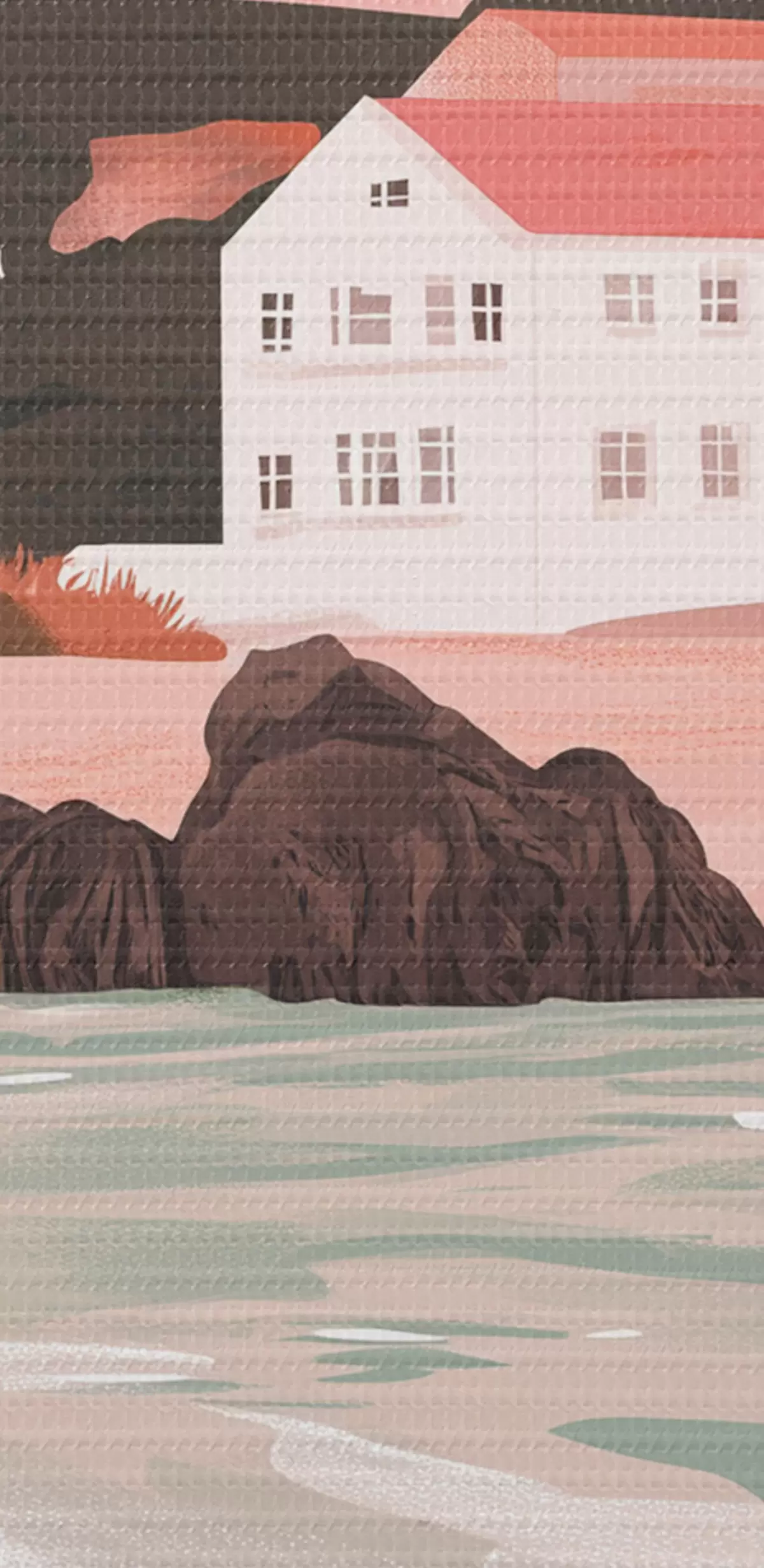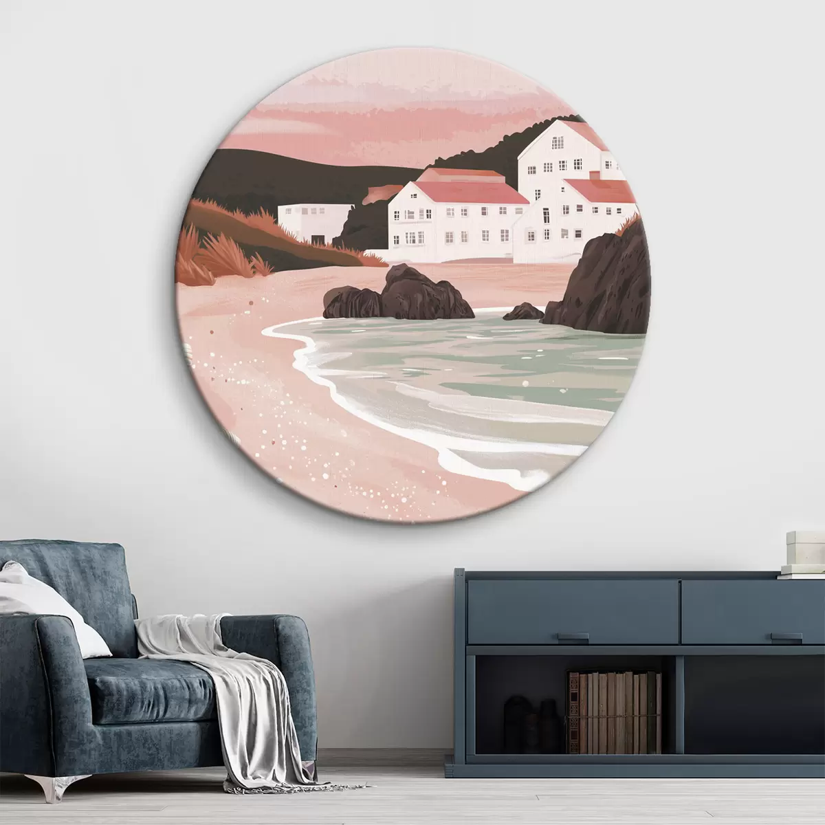 Ronde schilderijen Gezellig roze strand met witte huisjes en zeeschelpen Nr r44713
