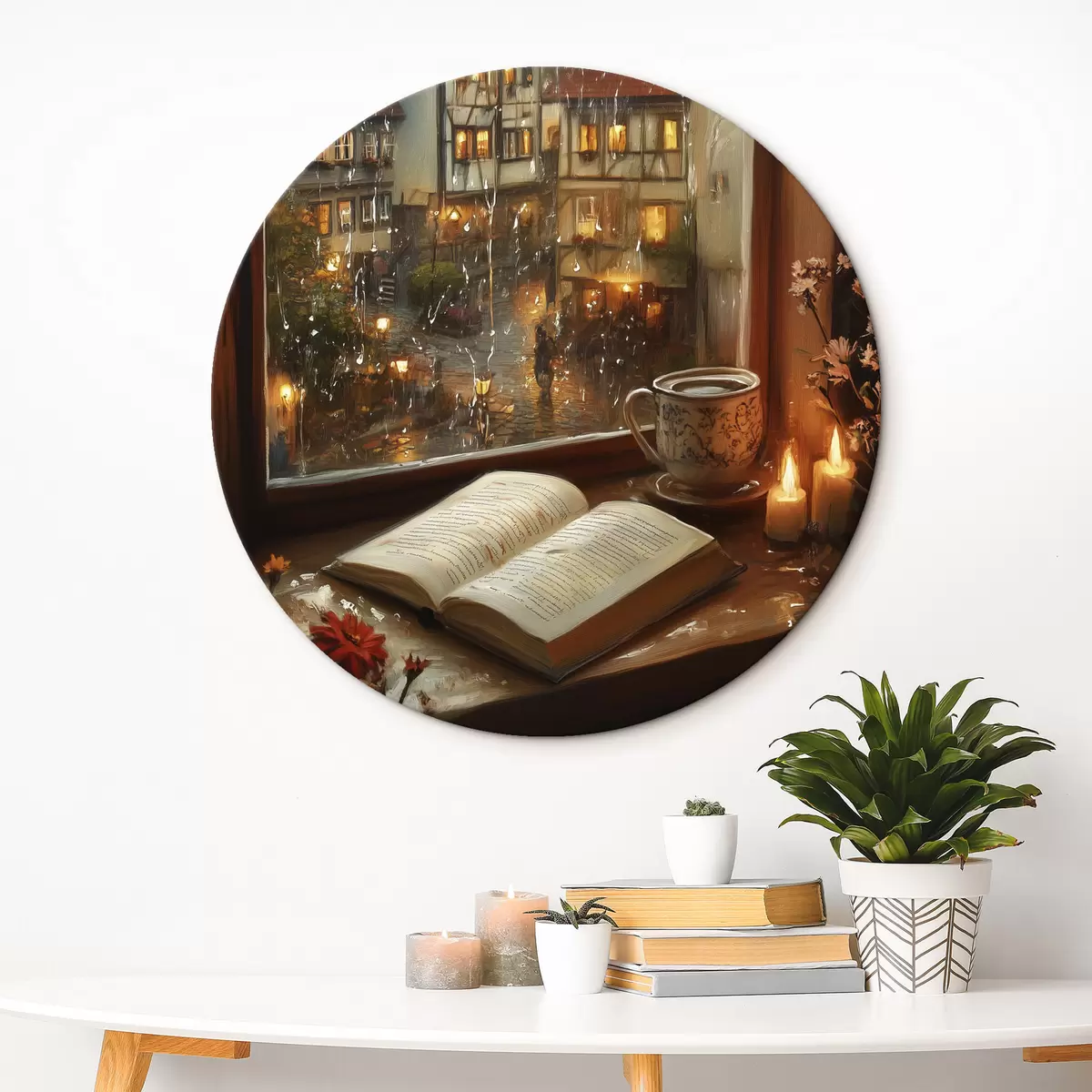 Ronde schilderijen Boek op de vensterbank, kaarsen, regenachtige dag, gezellig Nr r44722