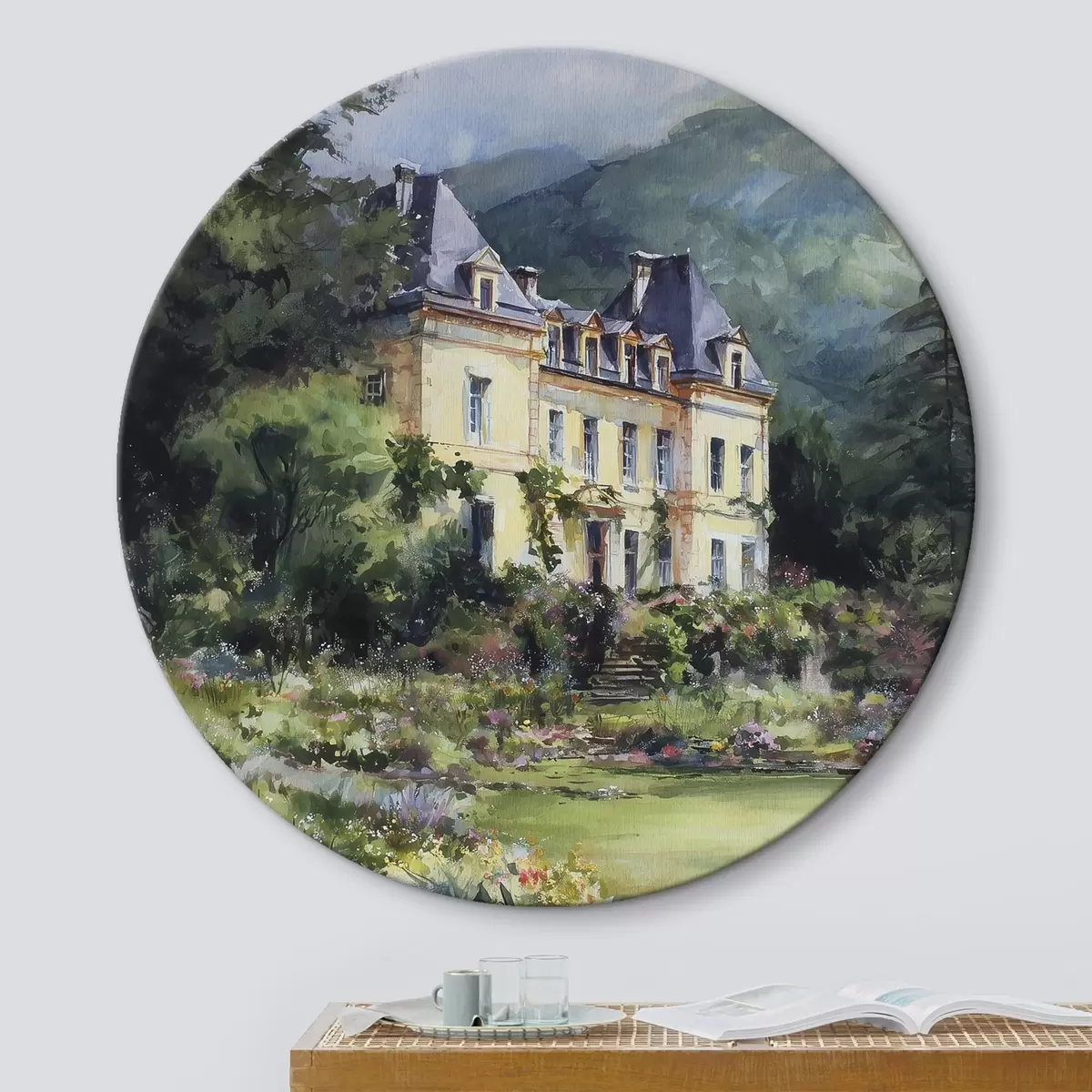 Ronde schilderijen Frans kasteel omringd door een tuin met lavendel Nr r44797
