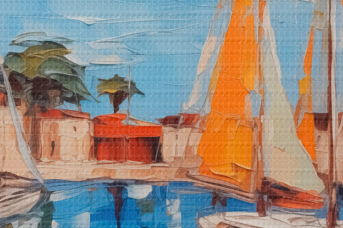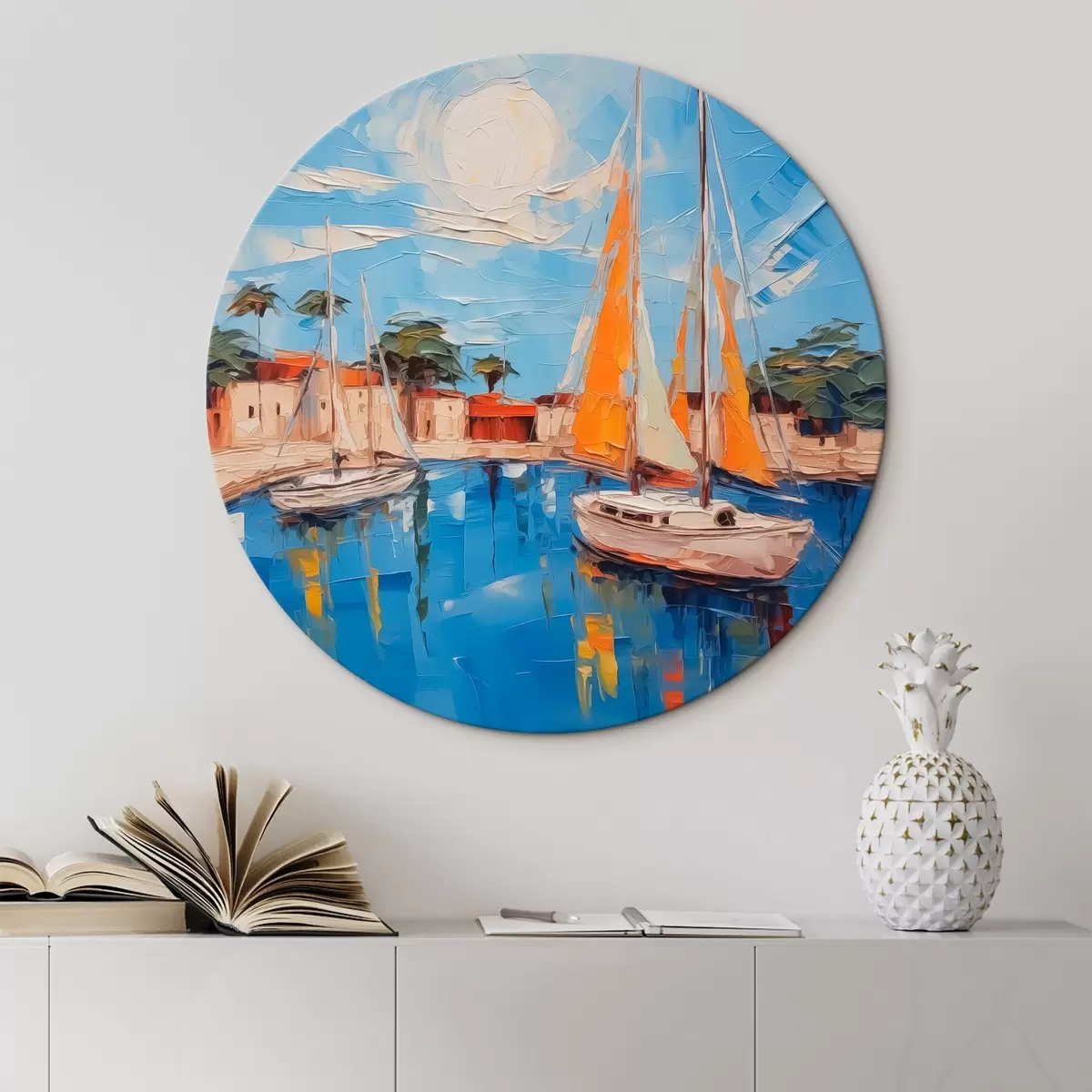 Ronde schilderijen Zeilboot bij de pier Nr r44824