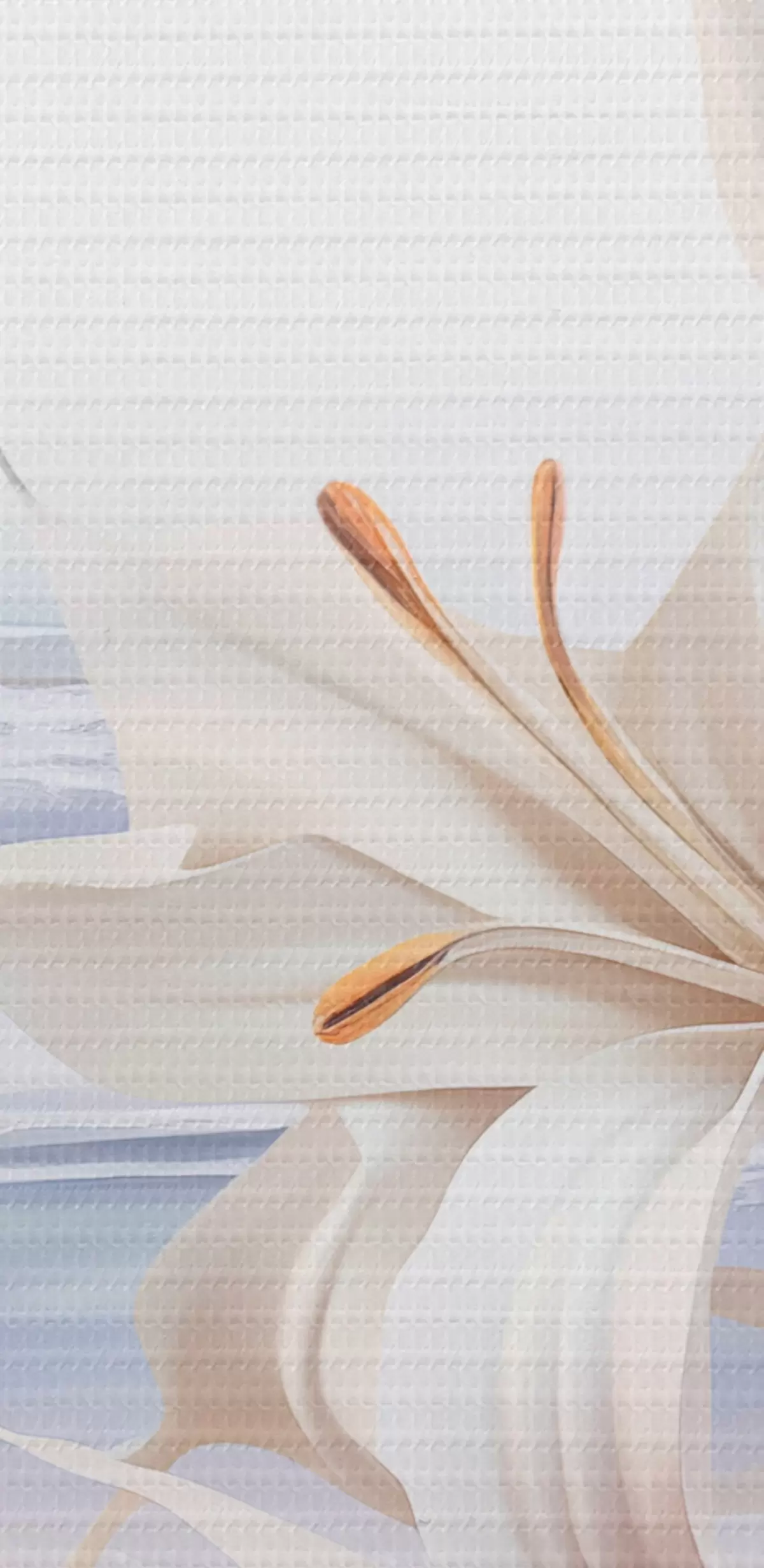 Ronde schilderijen Witte lelies met oranje stampers en lange bladeren op een strand met zachte golven op de achtergrond, pastelkleuren Nr r44850