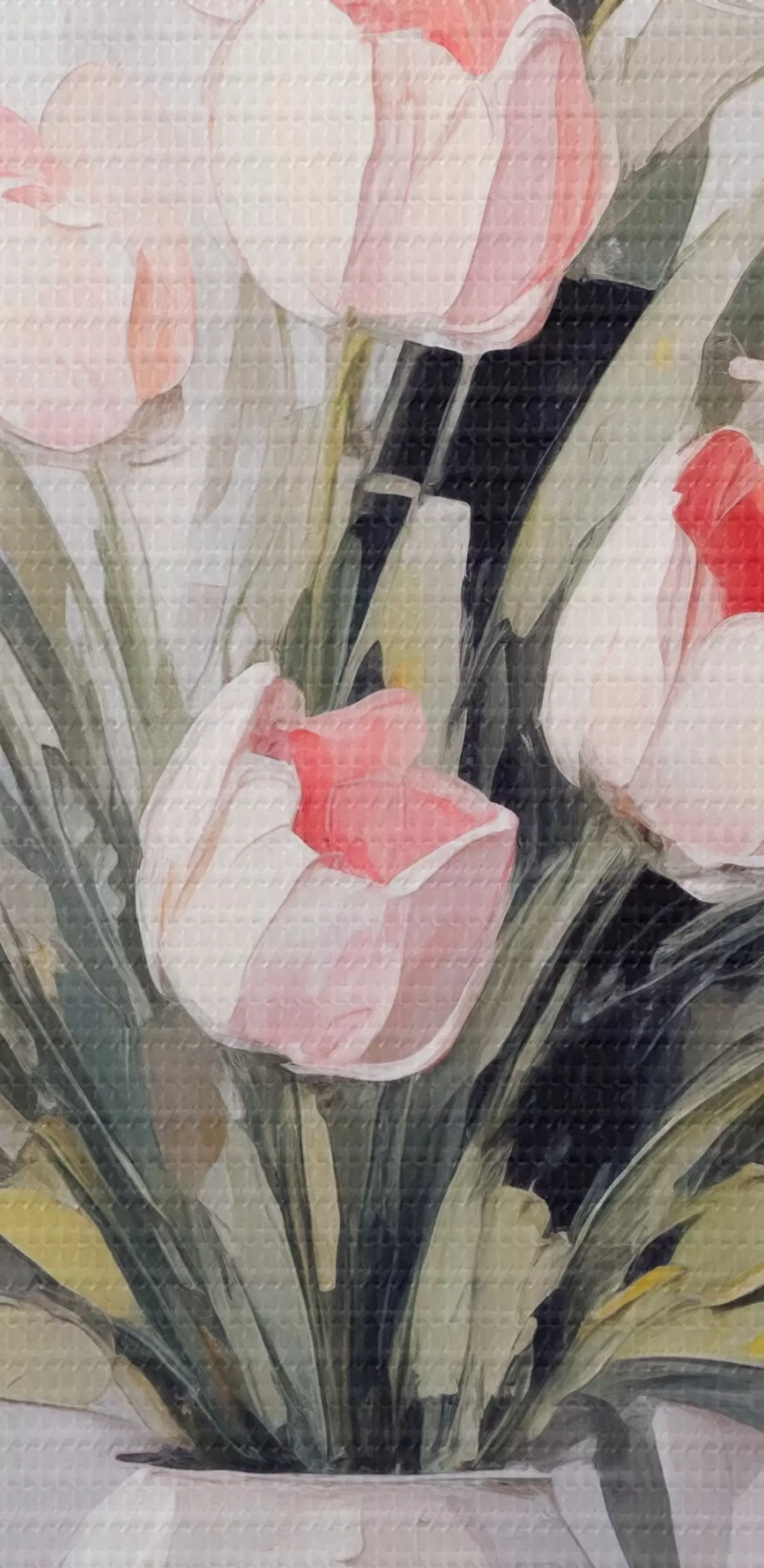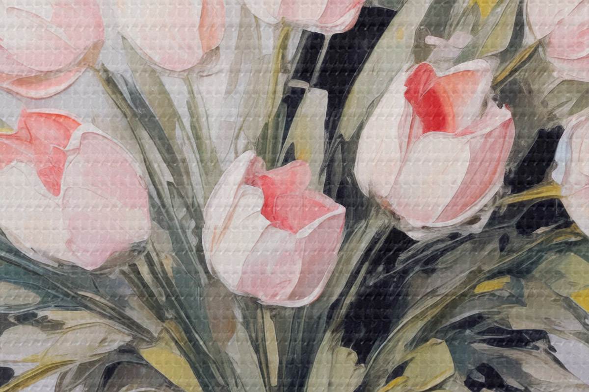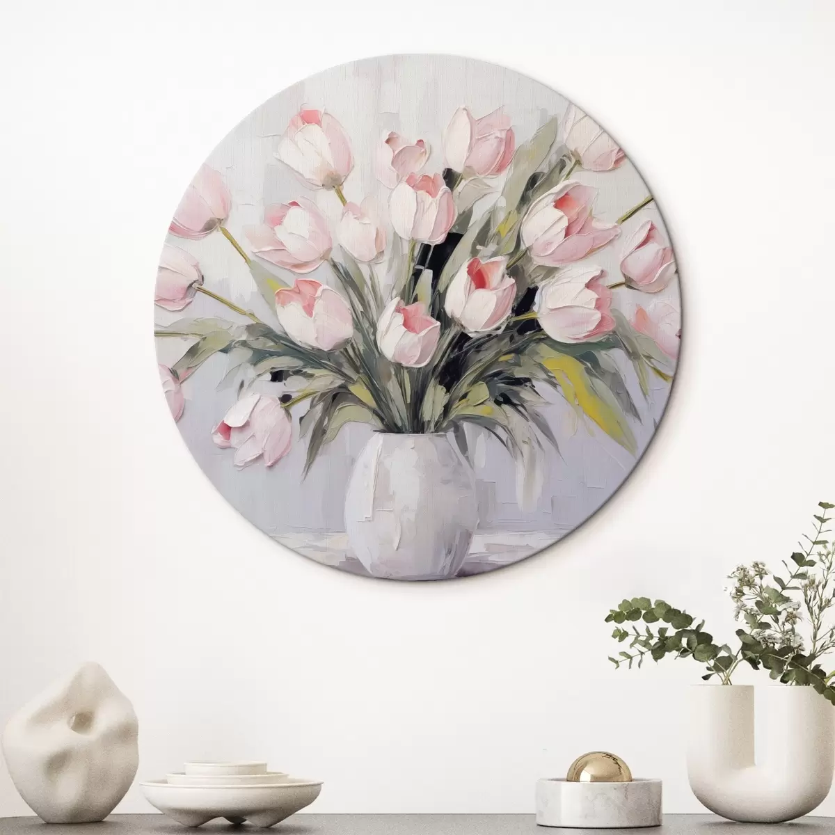 Ronde schilderijen Een vaas met roze tulpen, groene bladeren, lichtgrijze achtergrond , olieverfschilderij stijl, dikke penseelstreken Nr r44852