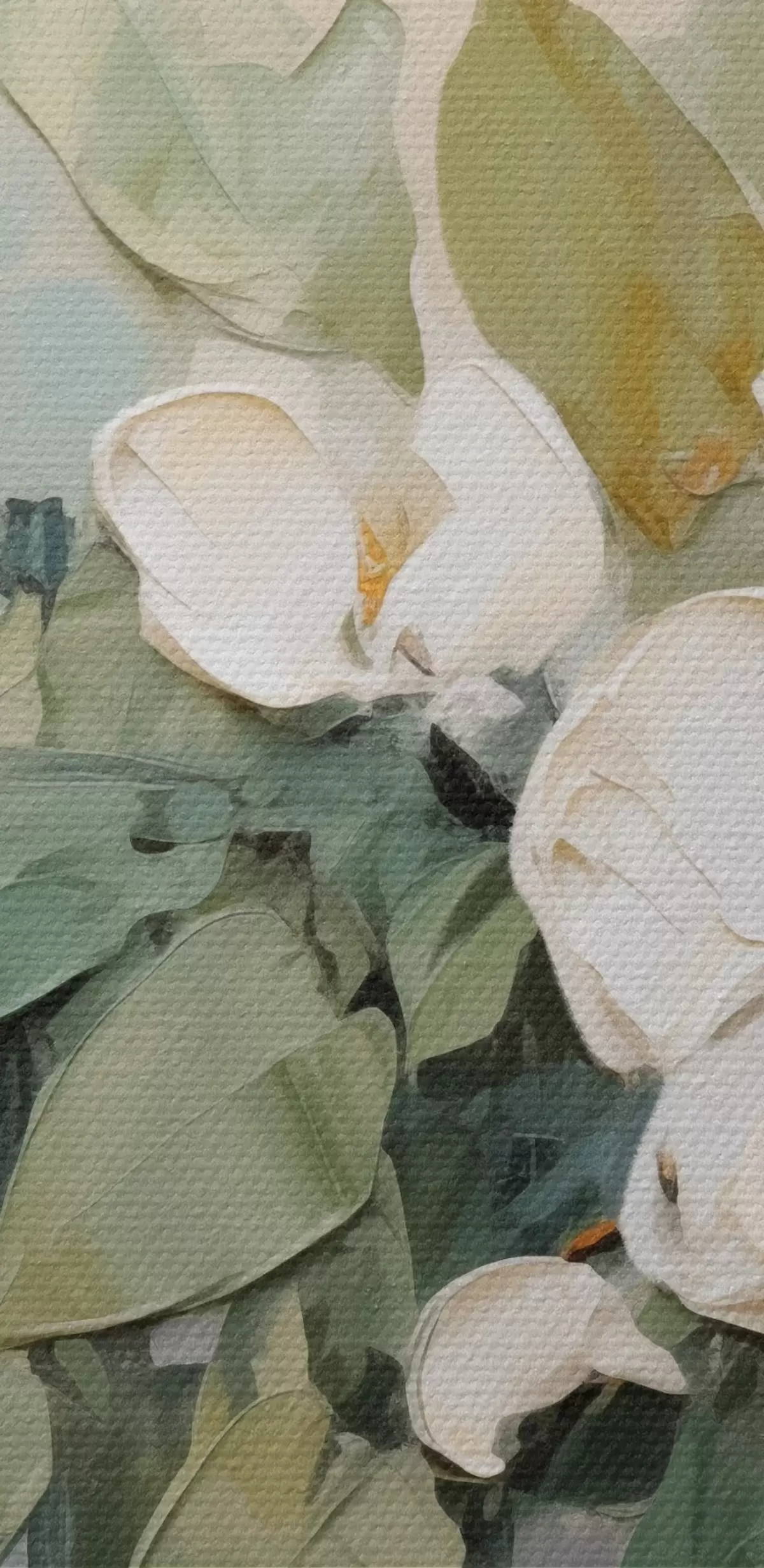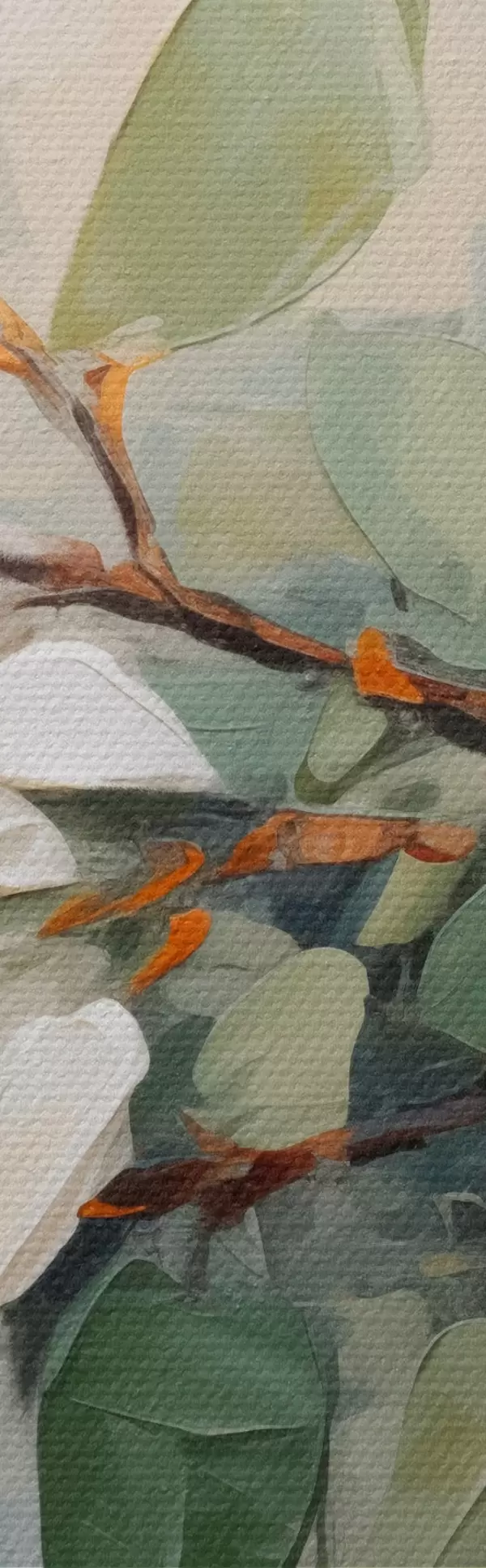 Ronde schilderijen Magnolia bloemen met groene bladeren op een tak, impasto structuurstijl, zacht kleurenpalet Nr r44853