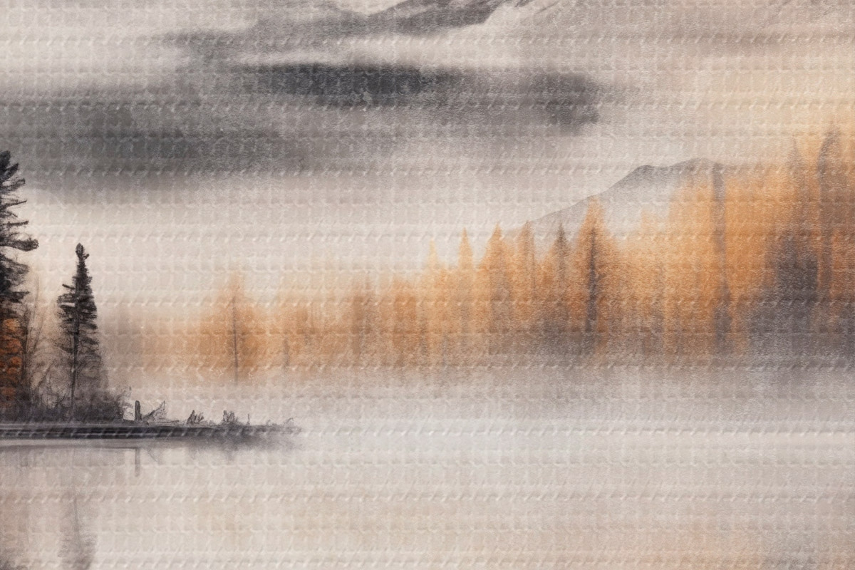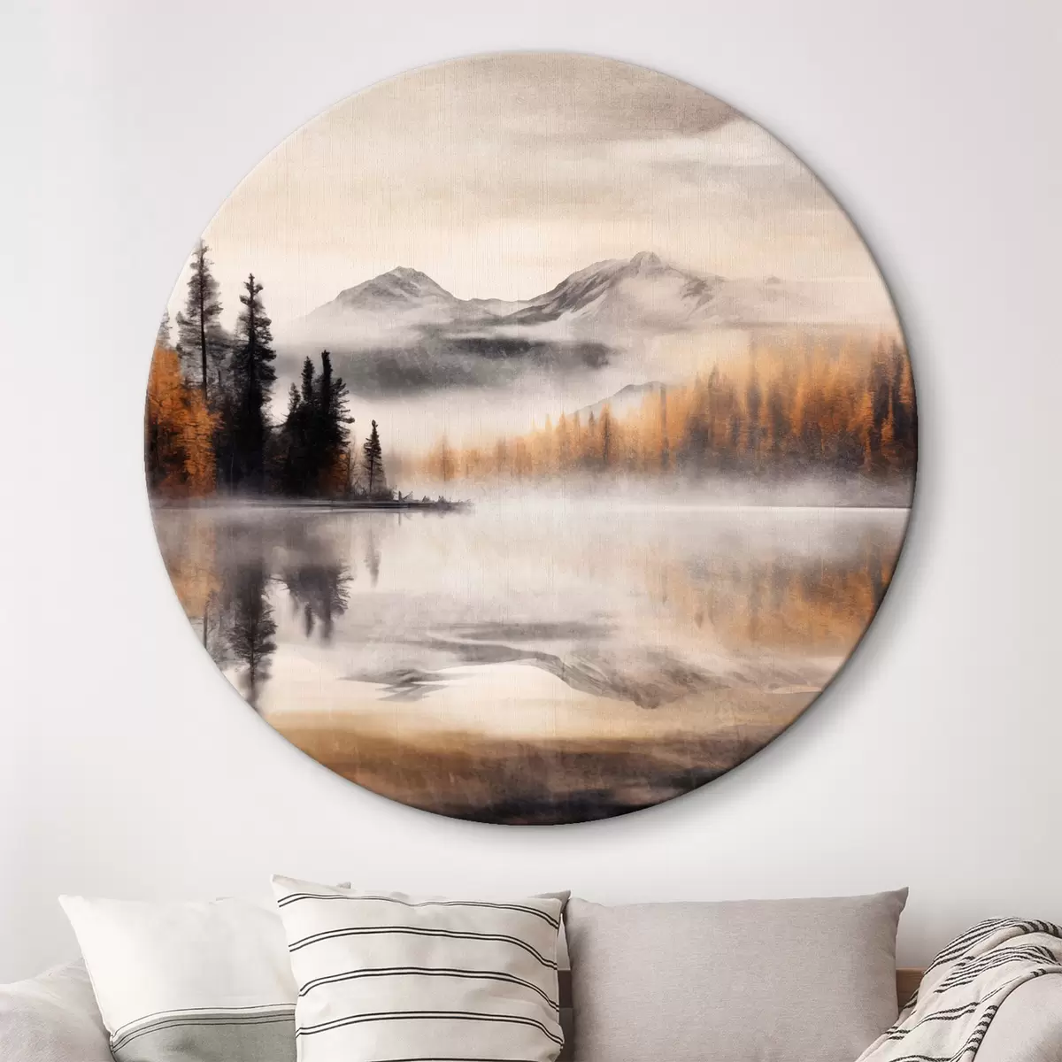 Ronde schilderijen Een mistig meerlandschap met dennenbomen en bergen, bewolkte grijze lucht Nr r44856