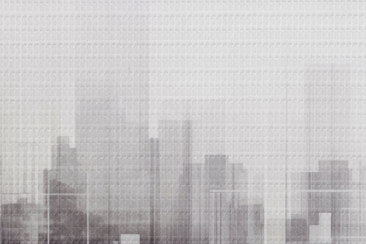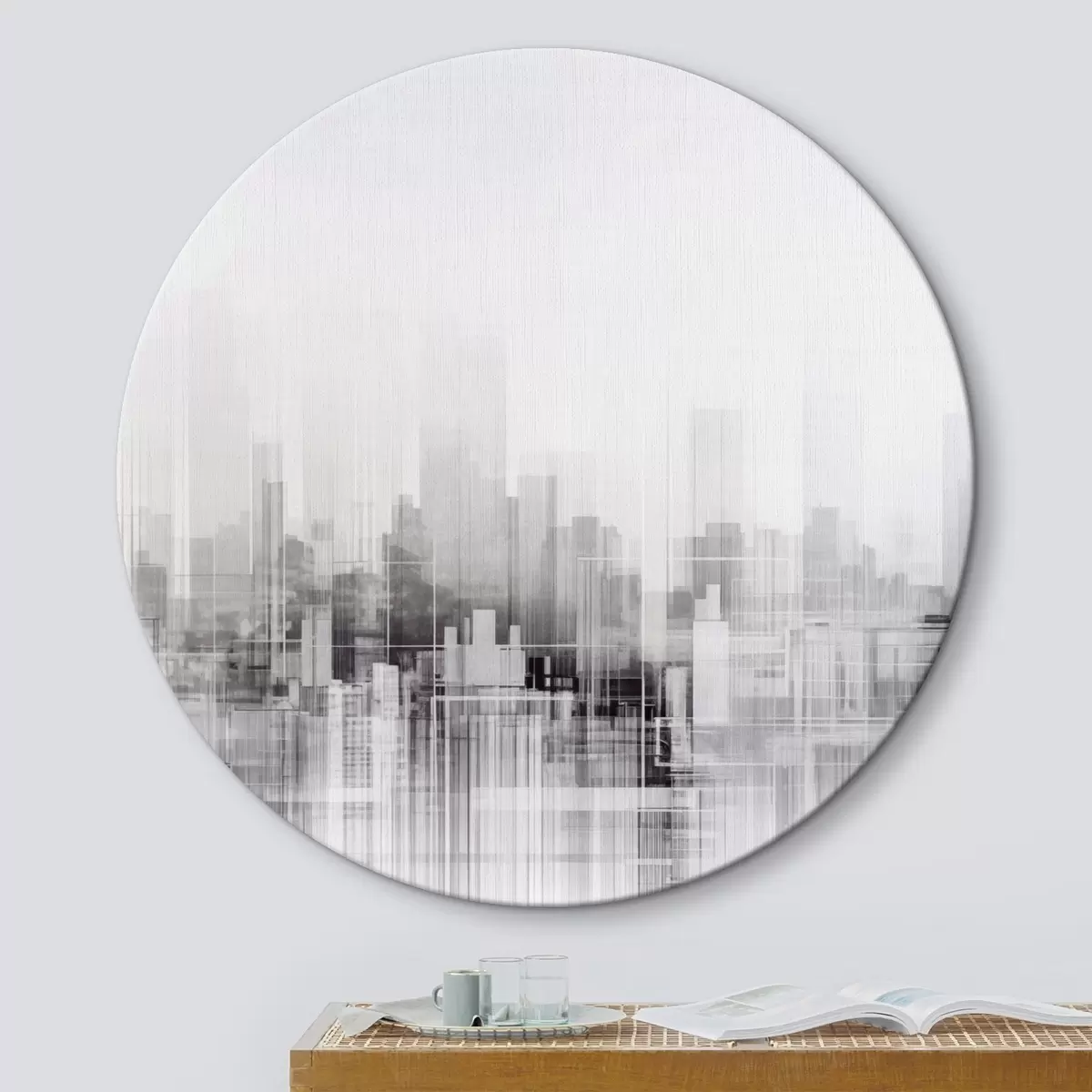 Ronde schilderijen Gestructureerd minimalistisch stadslandschap met hoge gebouwen en wolkenkrabbers, afgetekend tegen een witte lucht Nr r44863