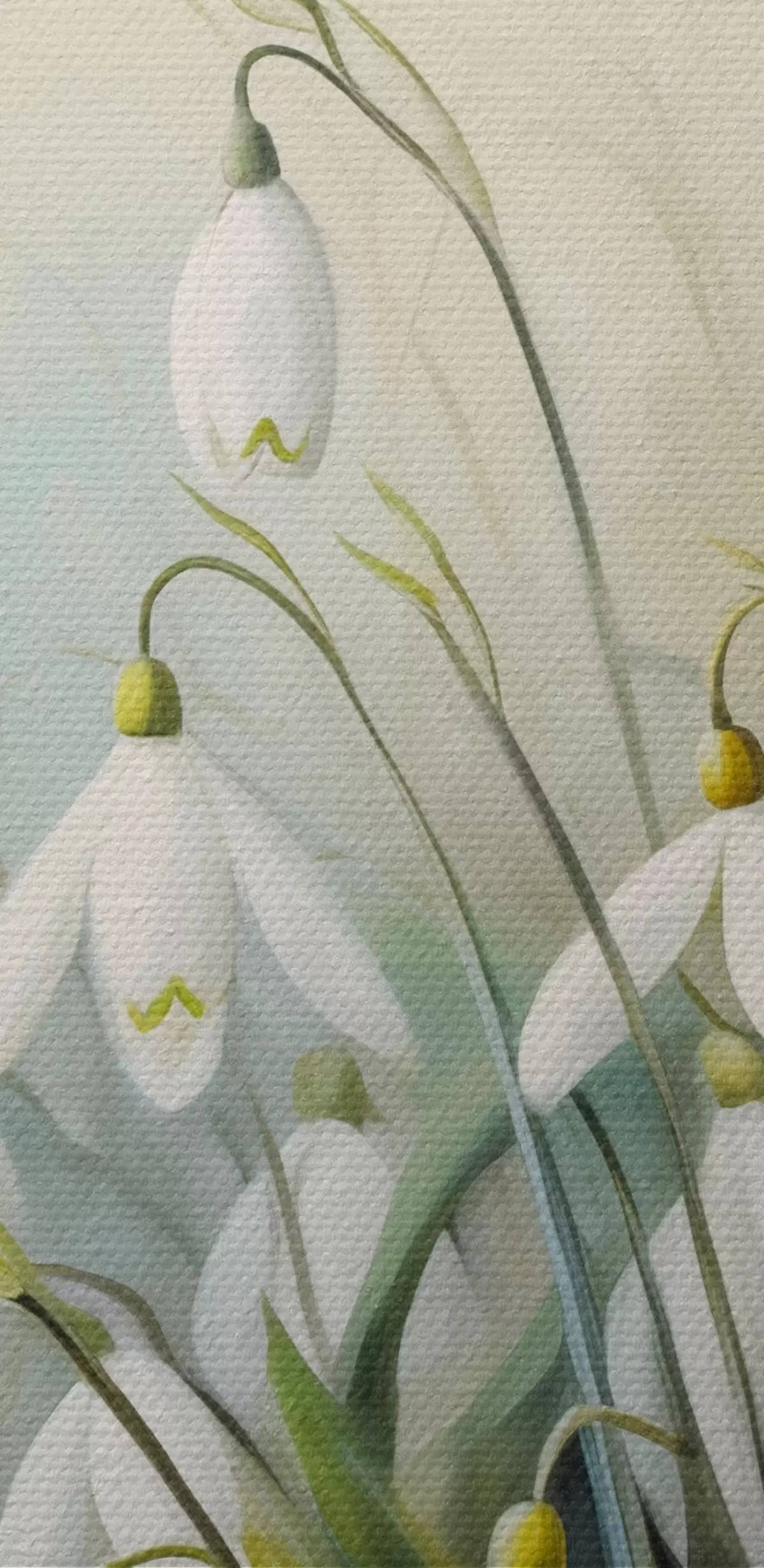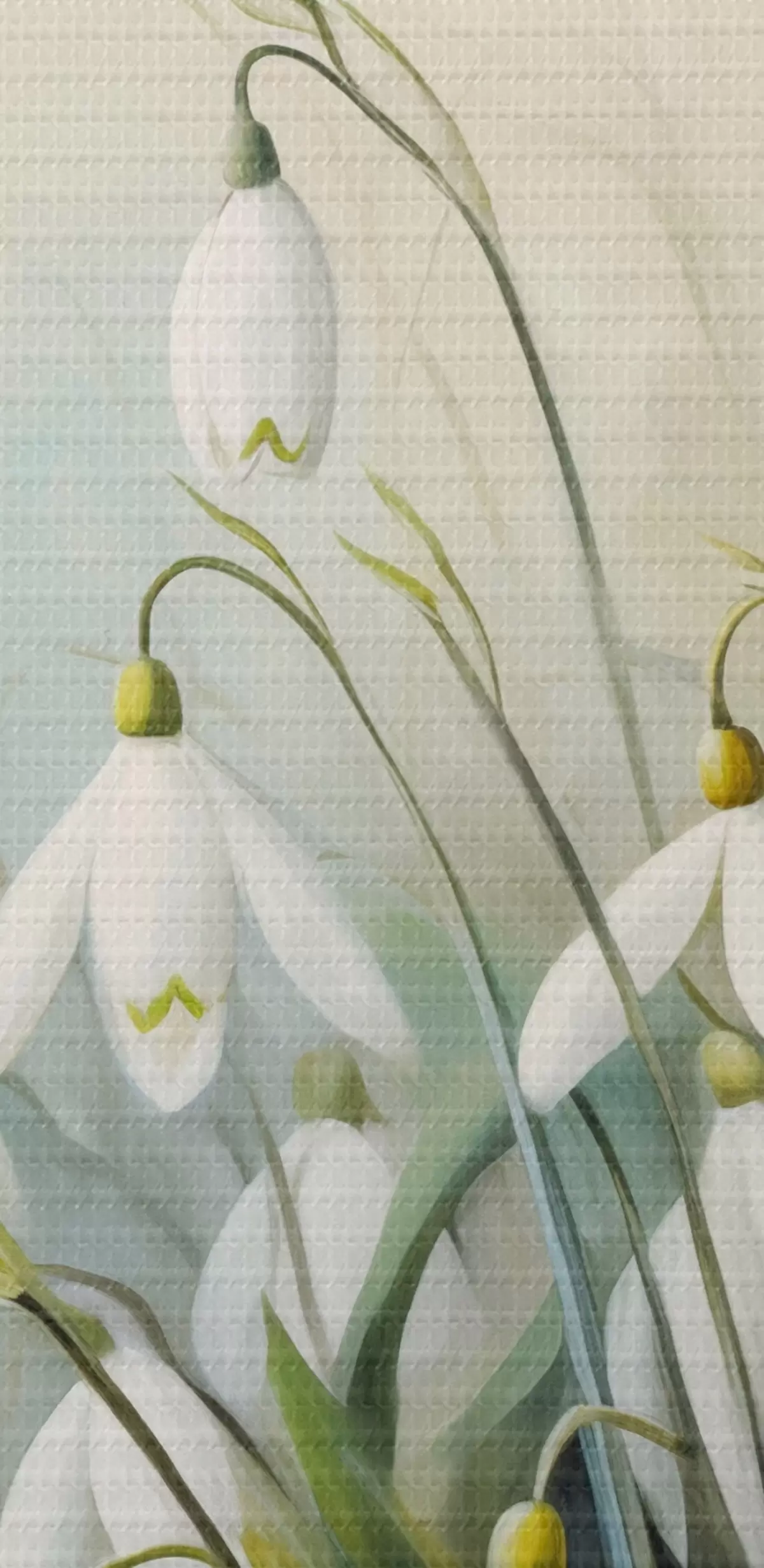 Ronde schilderijen Witte sneeuwklokjesbloemen met blauwe en groene stengels en bladeren, zachte penseelstreken, onscherpe achtergrond r44864