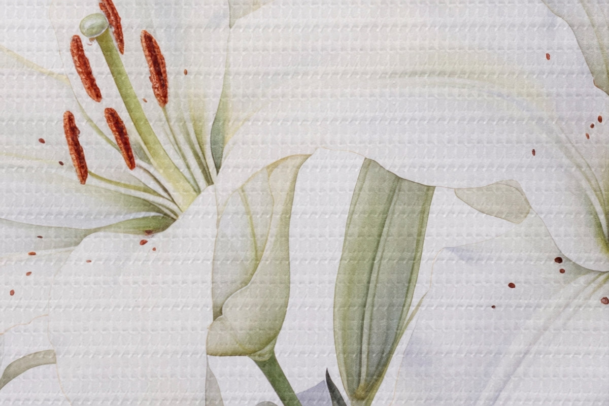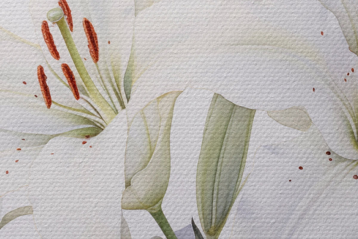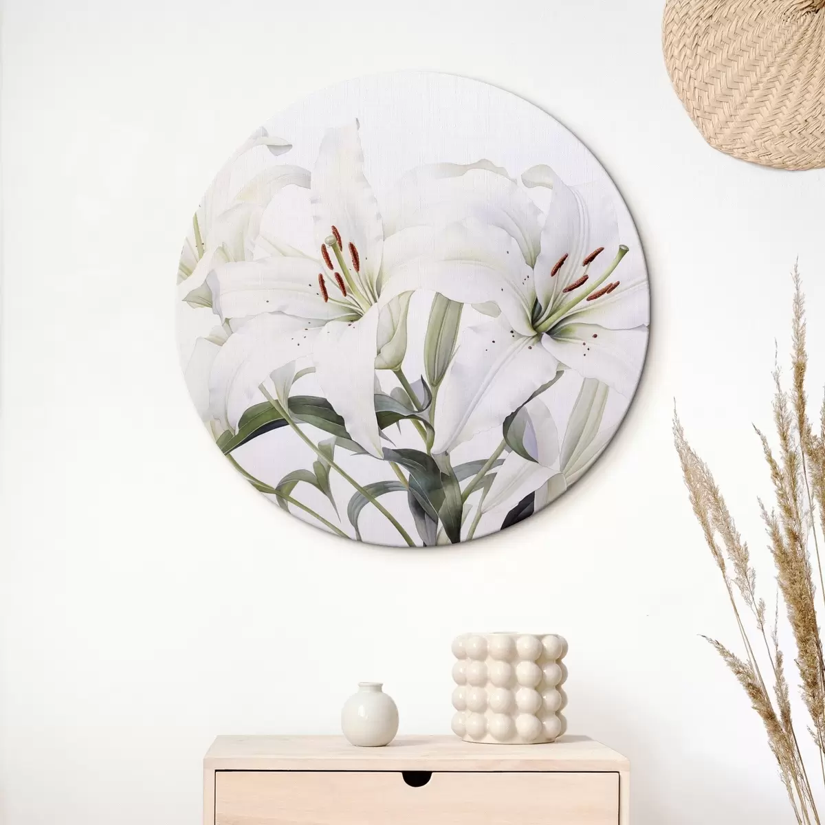 Ronde schilderijen Een boeket van witte lelies met groene bladeren, delicate bloemblaadjes en zachte witte achtergrond Nr r44868