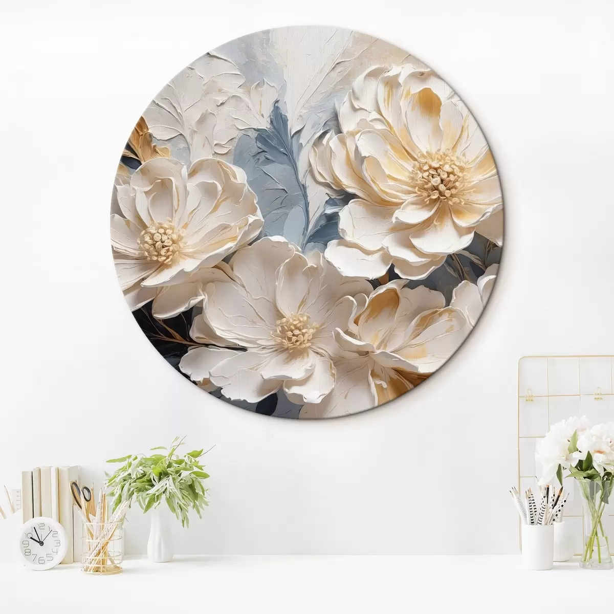 Ronde schilderijen Volumetrische crèmekleurige pioenrozen op een lichtblauwe achtergrond r44880