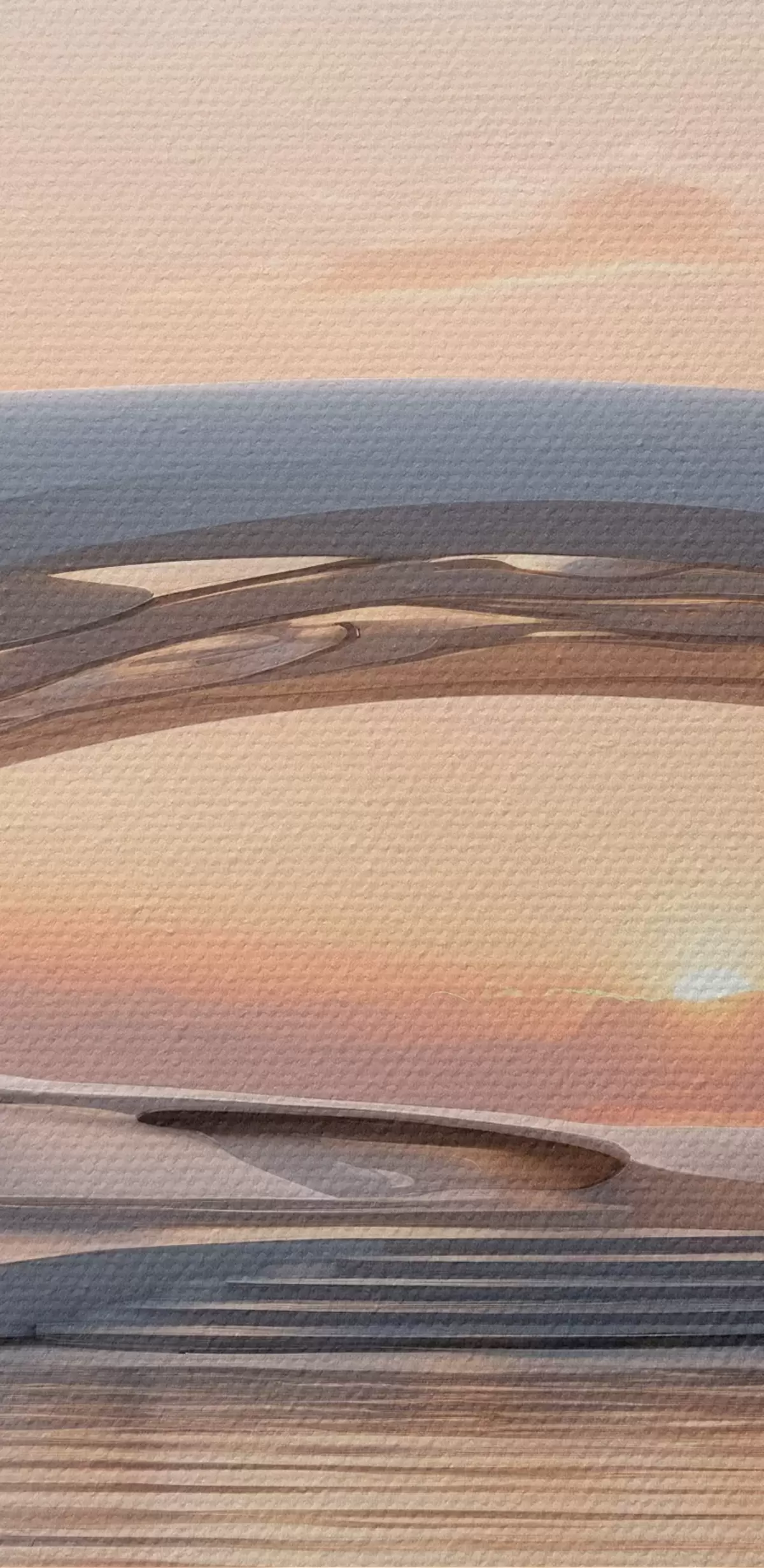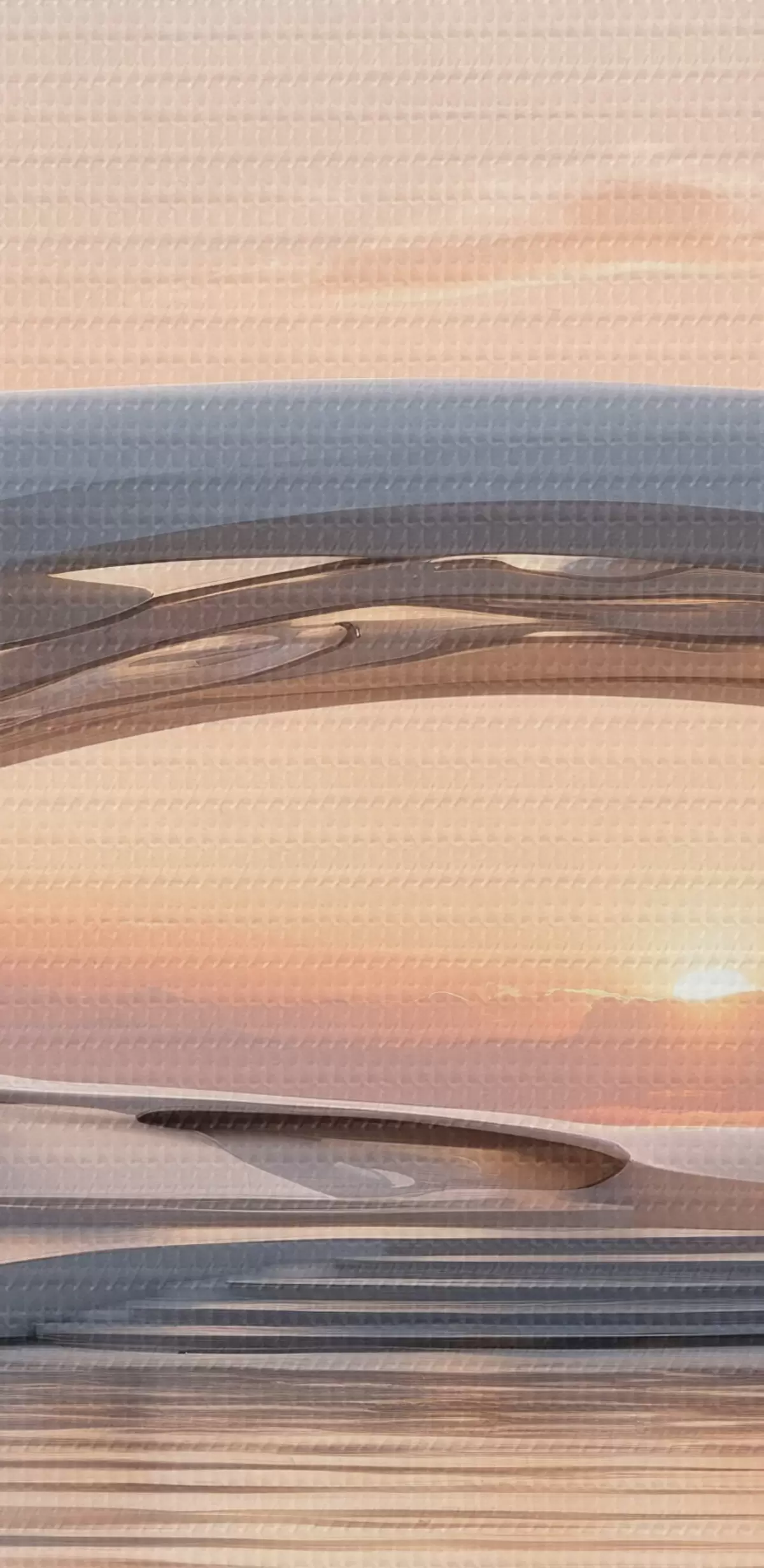 Ronde schilderijen Futuristisch gebouw op het water tegen een roze zonsondergang Nr r44884