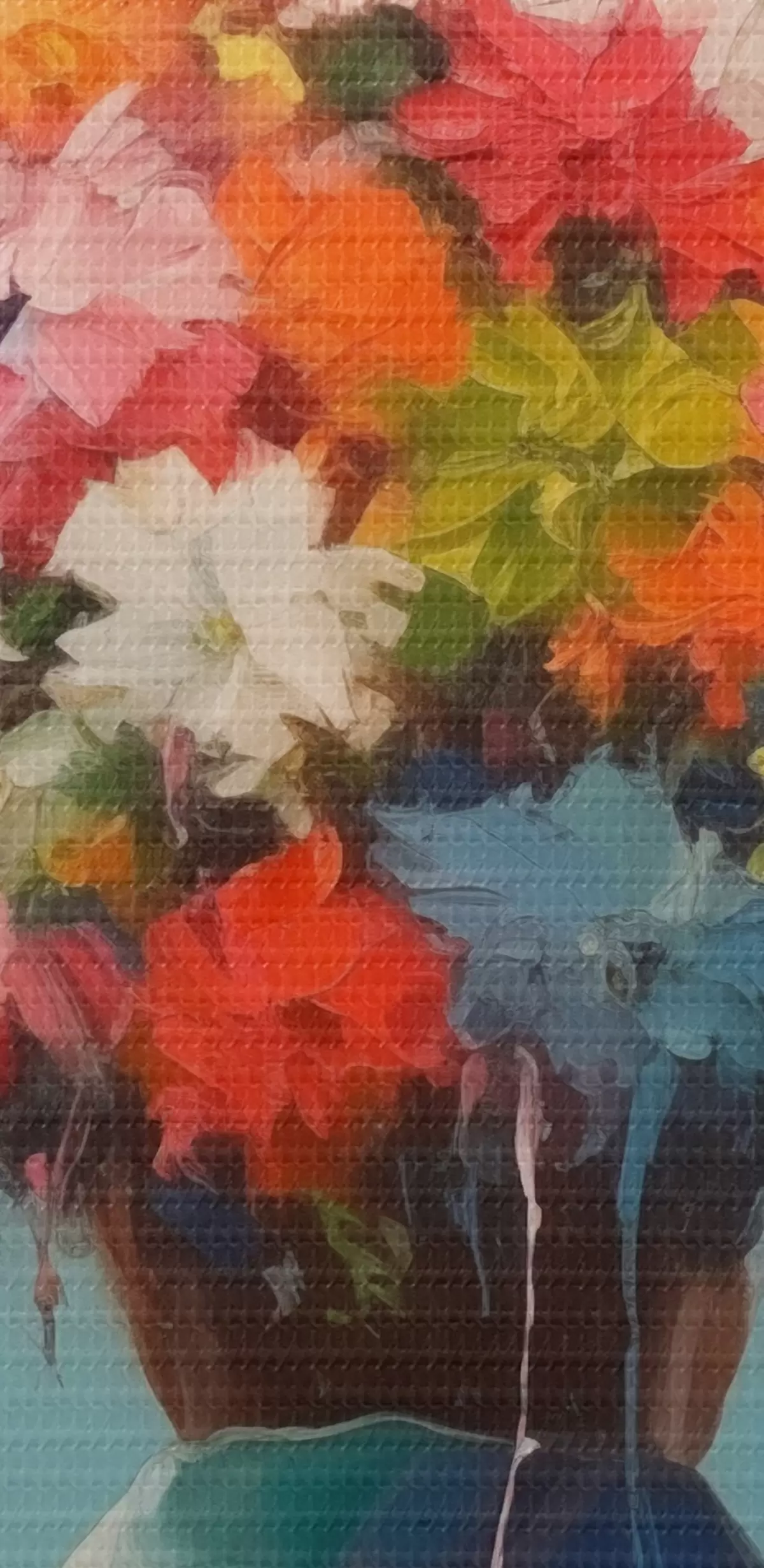 Het schilderij kan direct na ontvangst worden opgehangen. Het schilderij wordt opgespannen op een 2 cm breed houten spieraam.