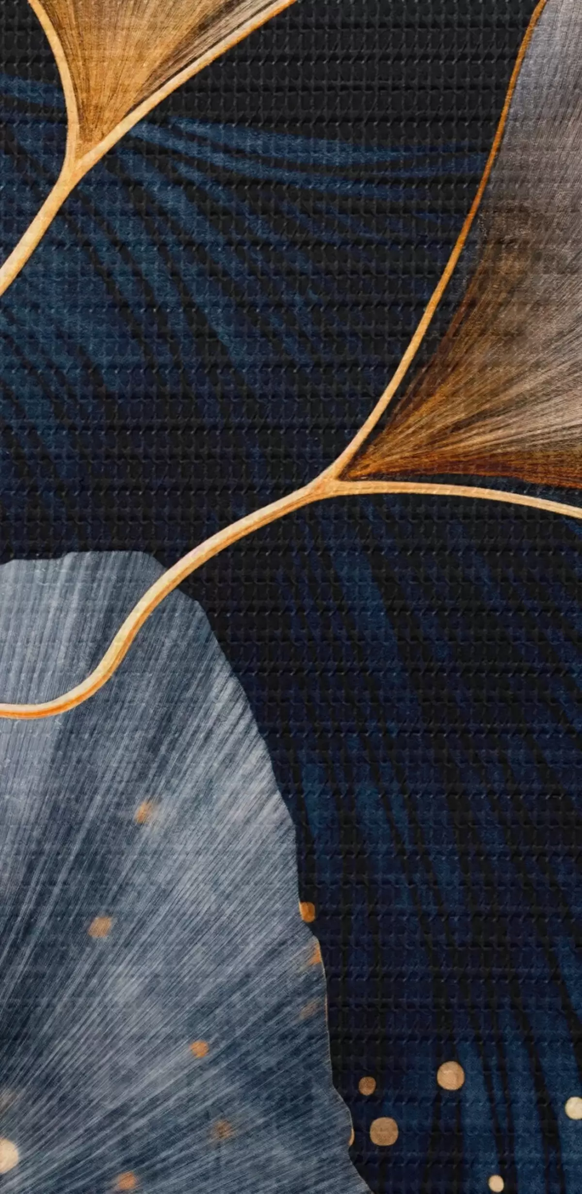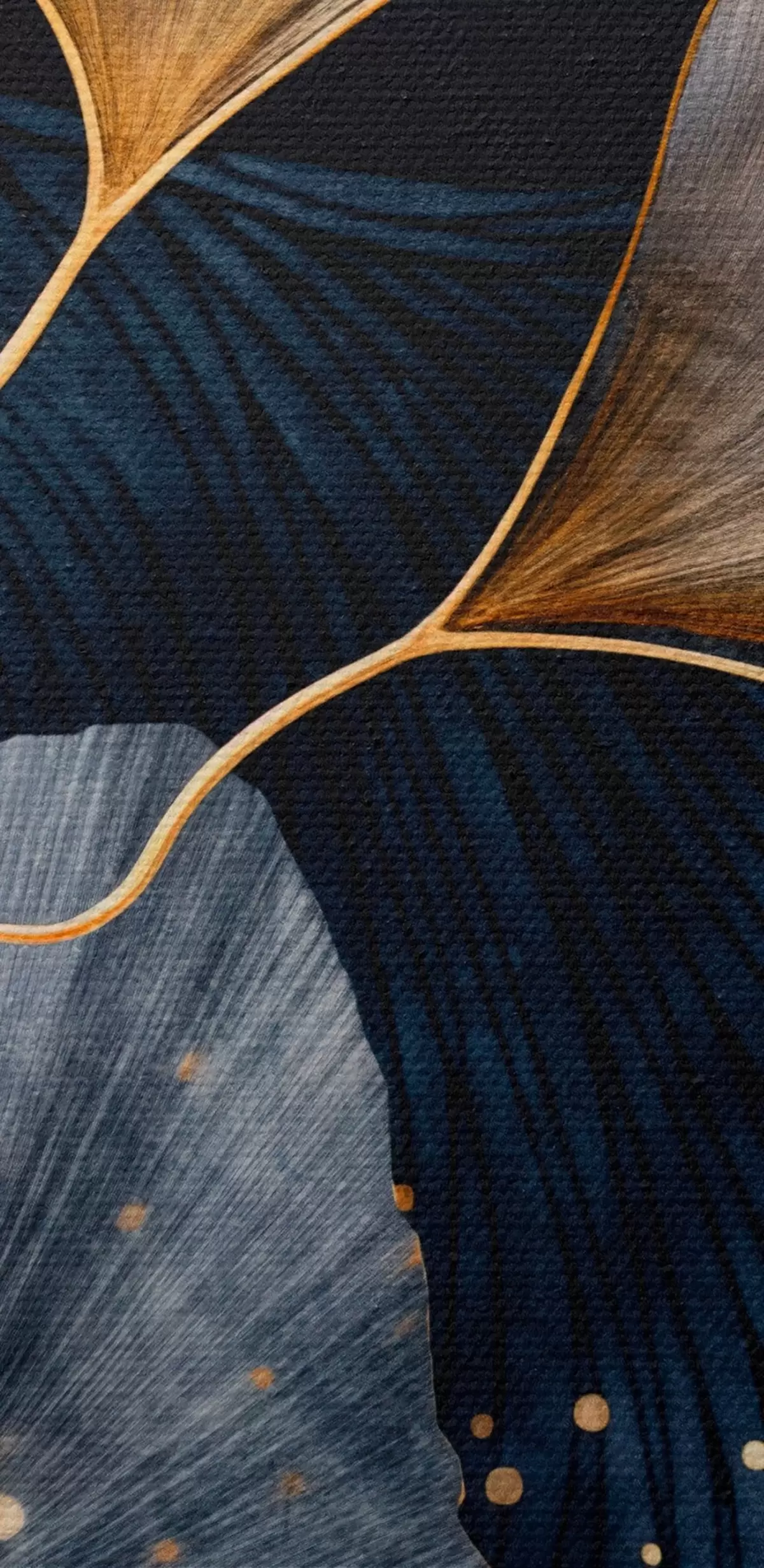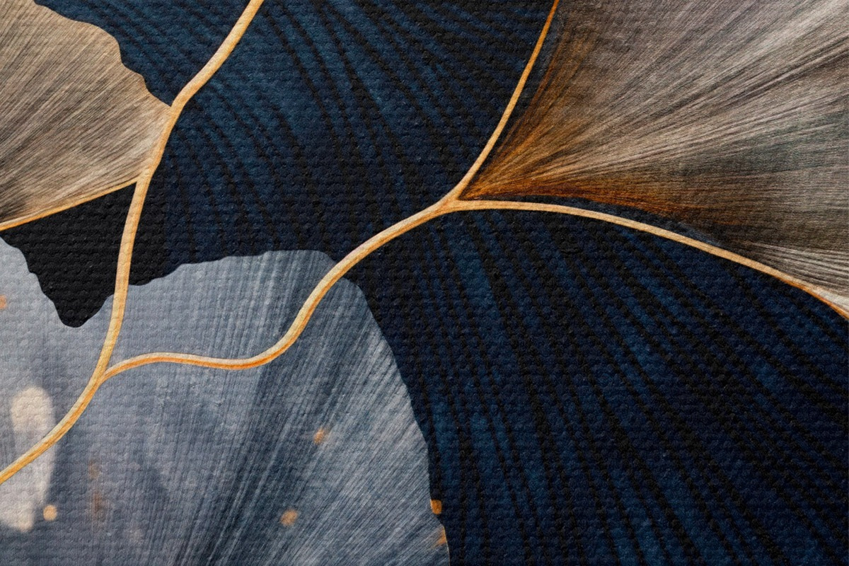 Ronde schilderijen Ginkgo bladeren in gele en blauwe tinten, elegante donkere achtergrond, moderne kunst, minimalistische stijl, op de natuur geïnspireerd r44921