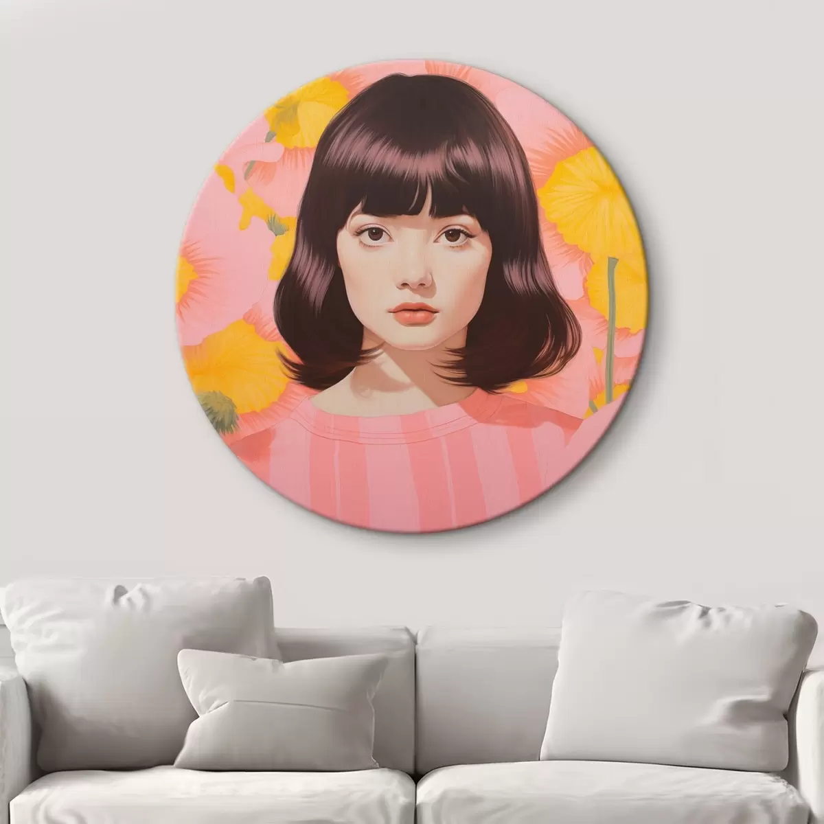 Ronde schilderijen Een decoratief minimalistisch portret van Aziatisch meisje in een veld van gele en roze bloemen Nr r44924