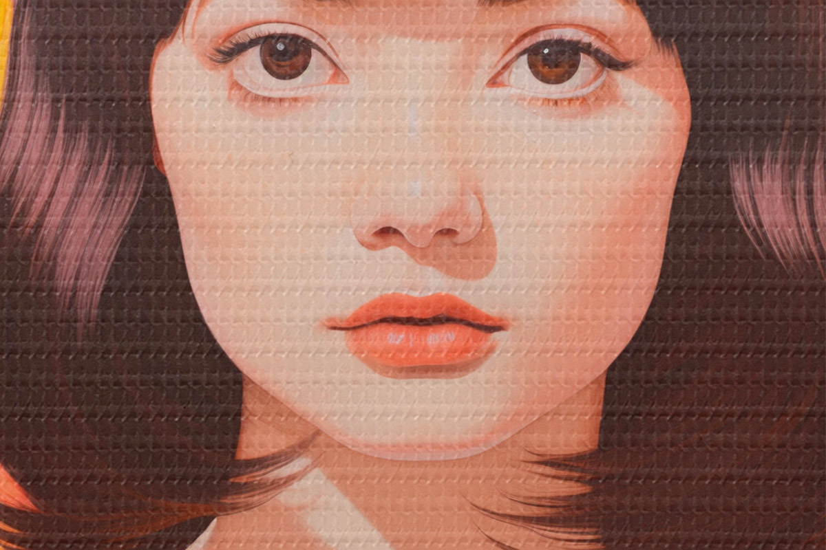 Ronde schilderijen Een decoratief minimalistisch portret van Aziatisch meisje in een veld van gele en roze bloemen r44924