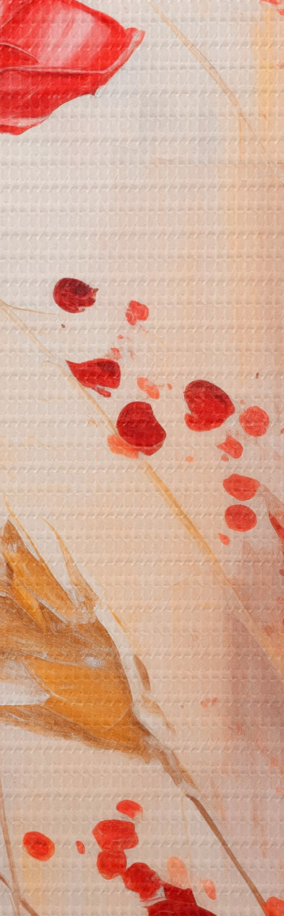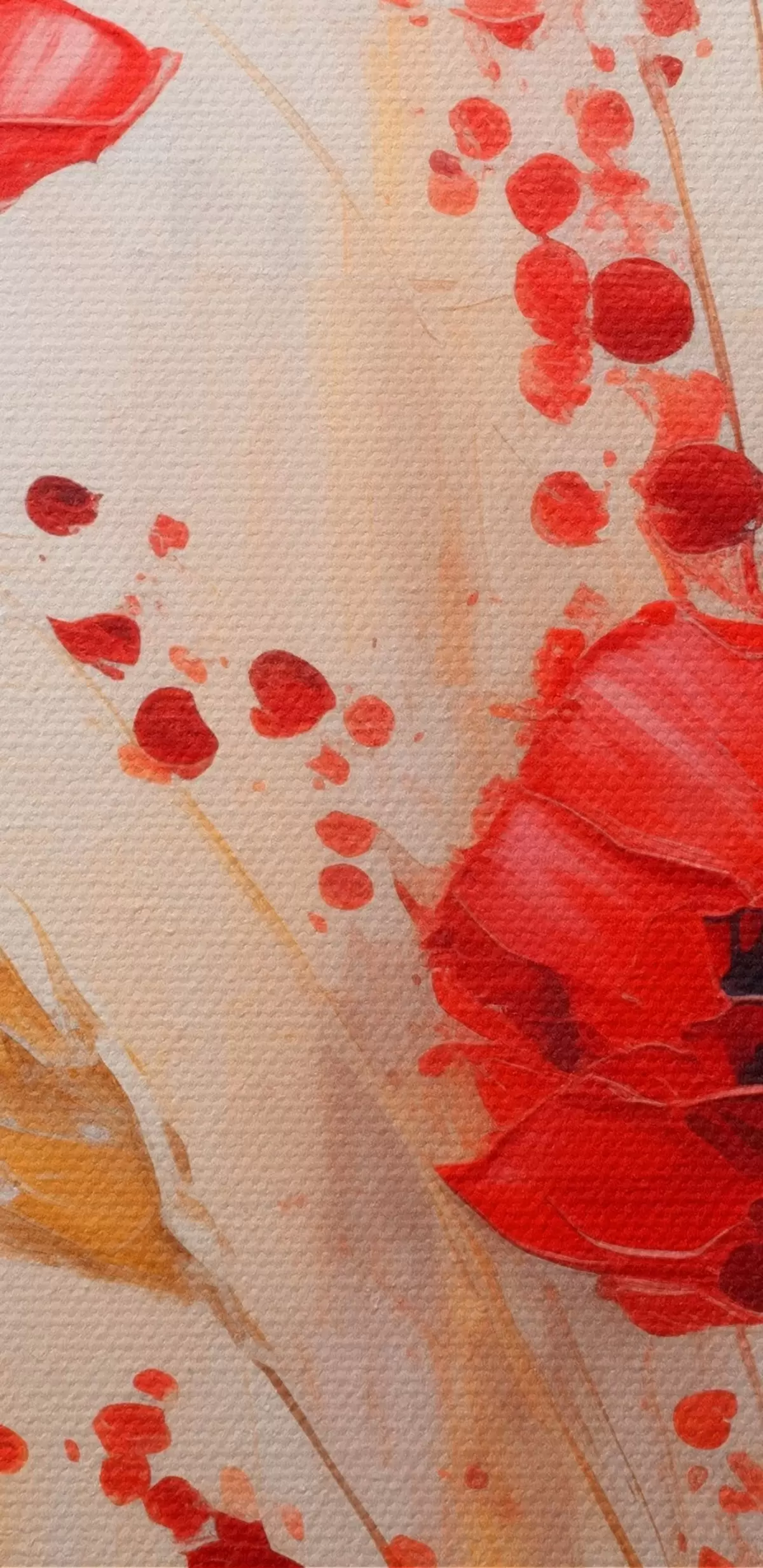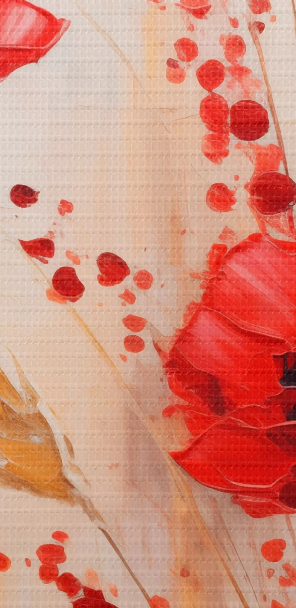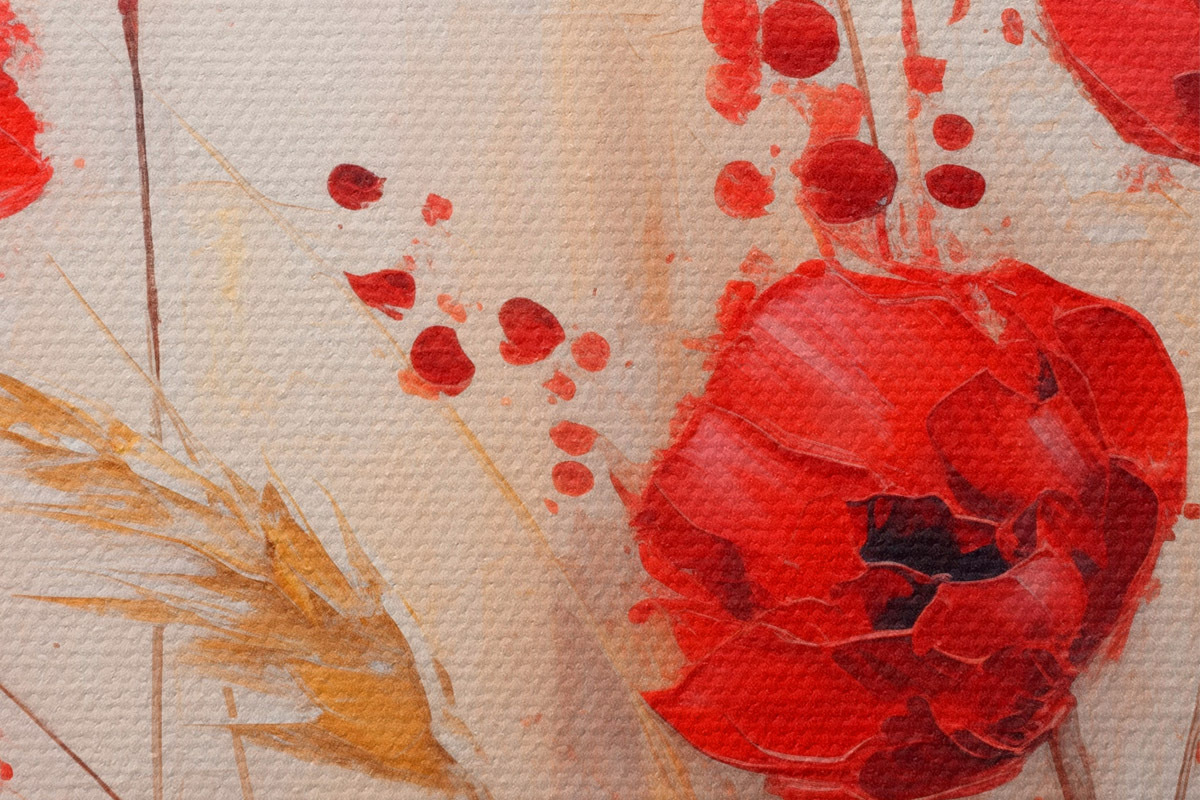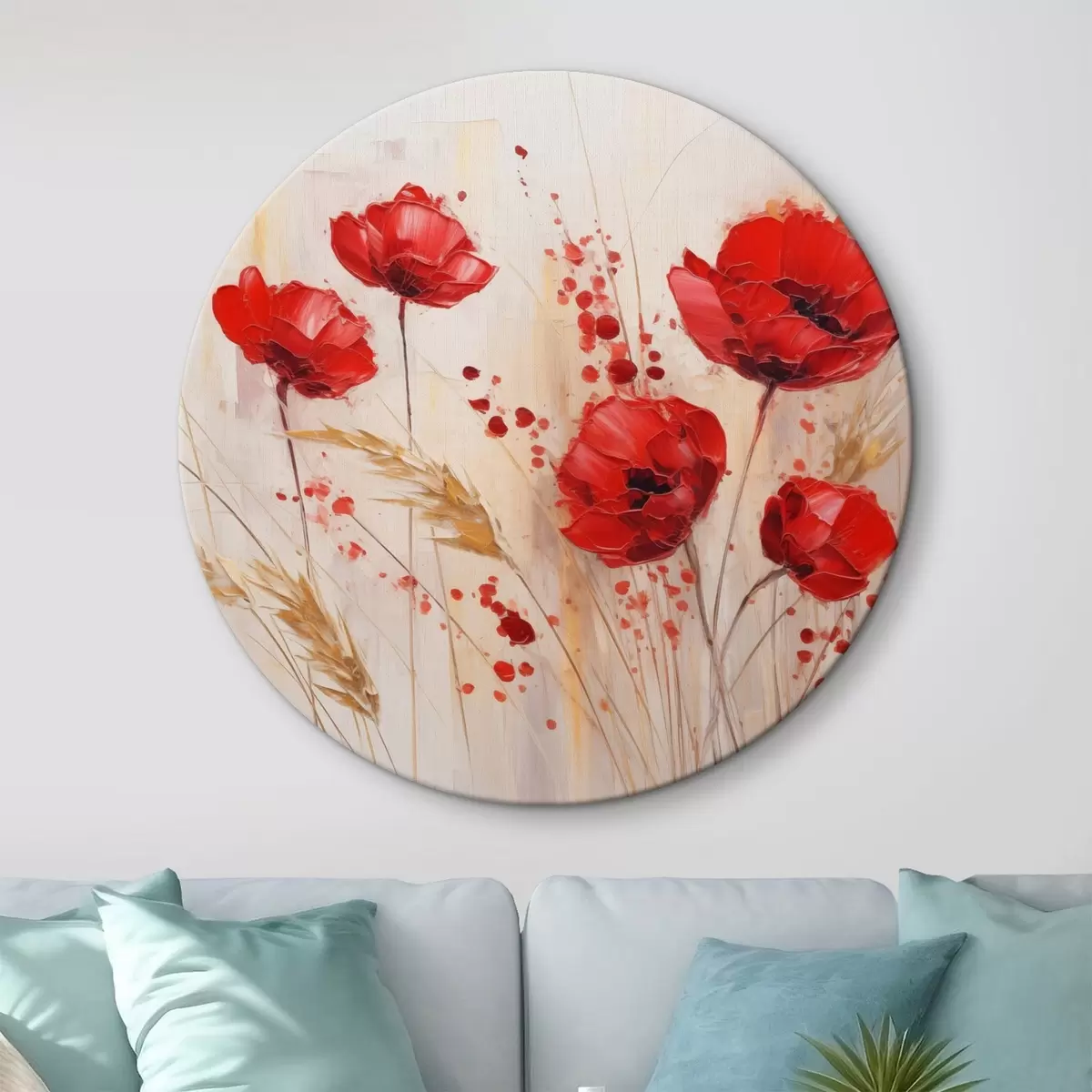 Ronde schilderijen Rode papaverbloemen met gele tarwestengels, tegen een zachte, neutrale achtergrond met spetters rode verf Nr r44926