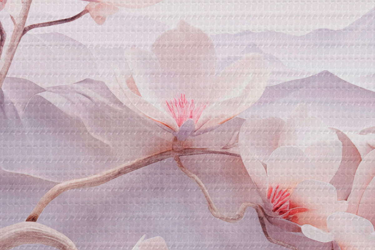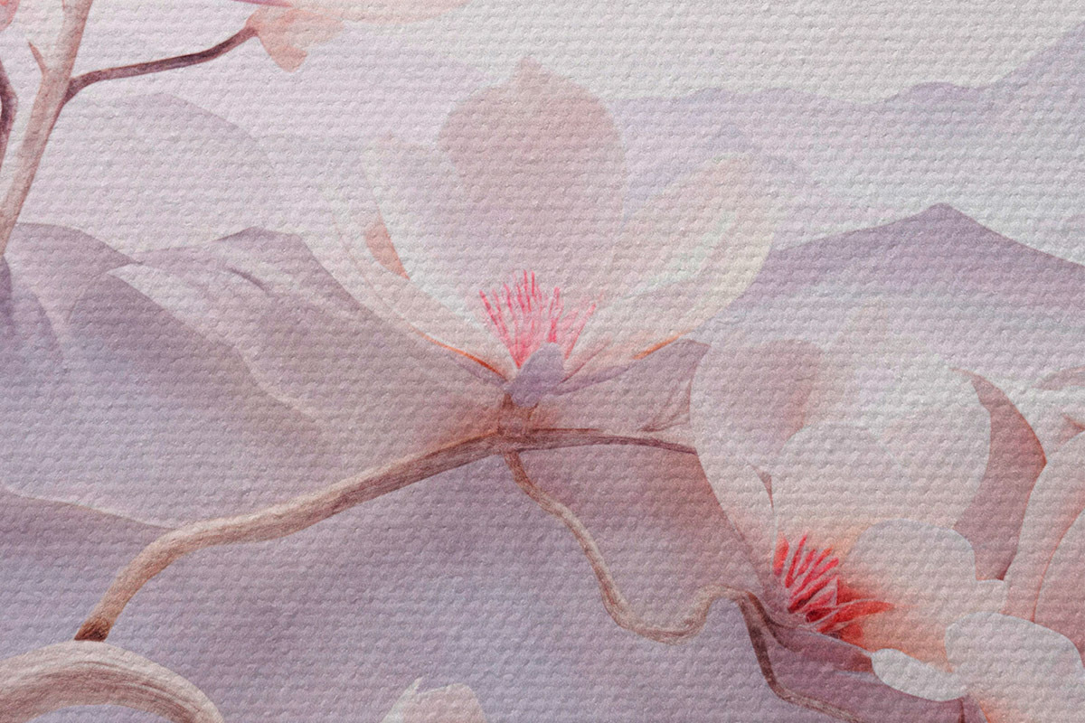 Ronde schilderijen Bloesemtak met roze bloemen, bergen op de achtergrond, zachte pastelkleuren, Japanse textuurkunst r44930