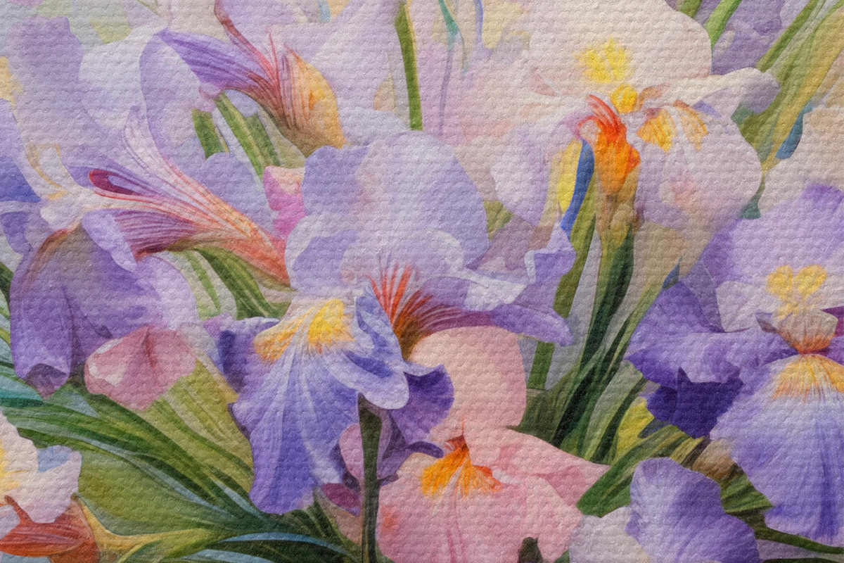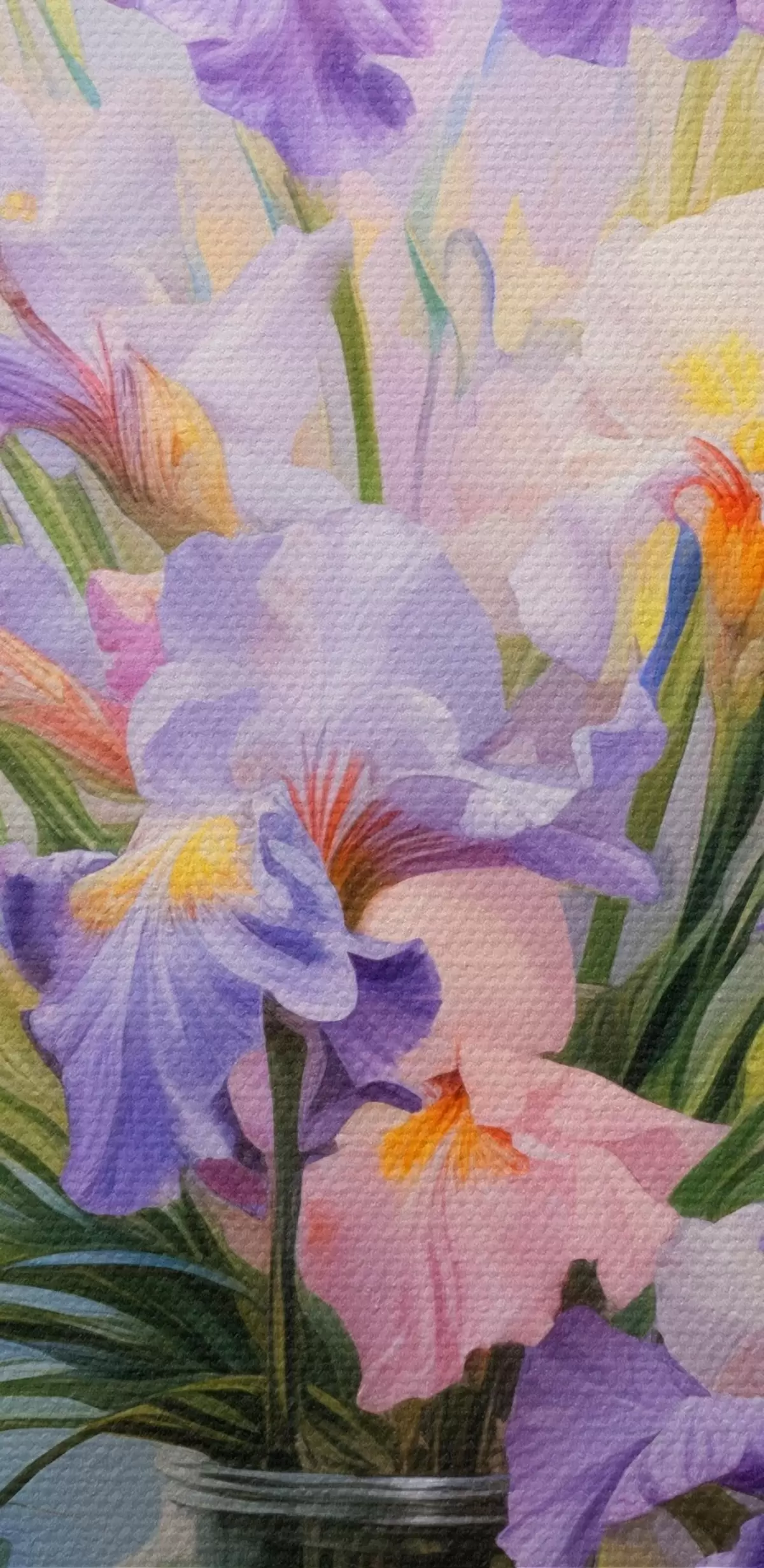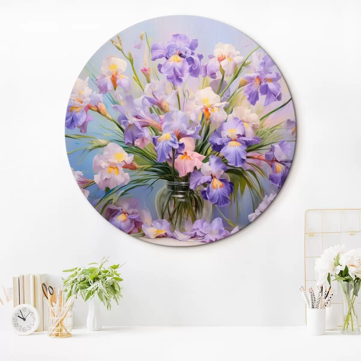 Ronde schilderijen Een vaas met veel pastelkleurige irissen, enkele bloemblaadjes verspreid op tafel, zachte pastelkleurige achtergrond met blauwe en roze tinten Nr r44933