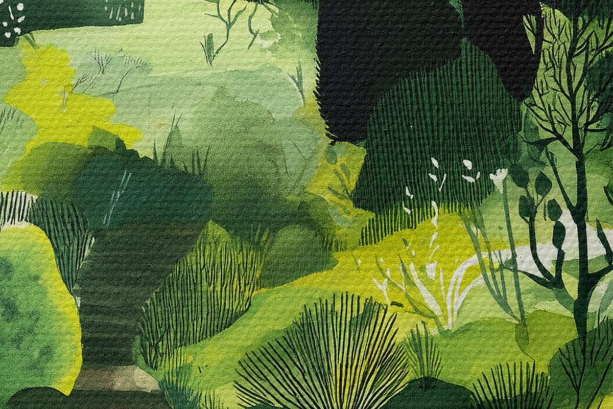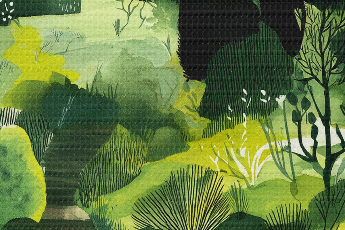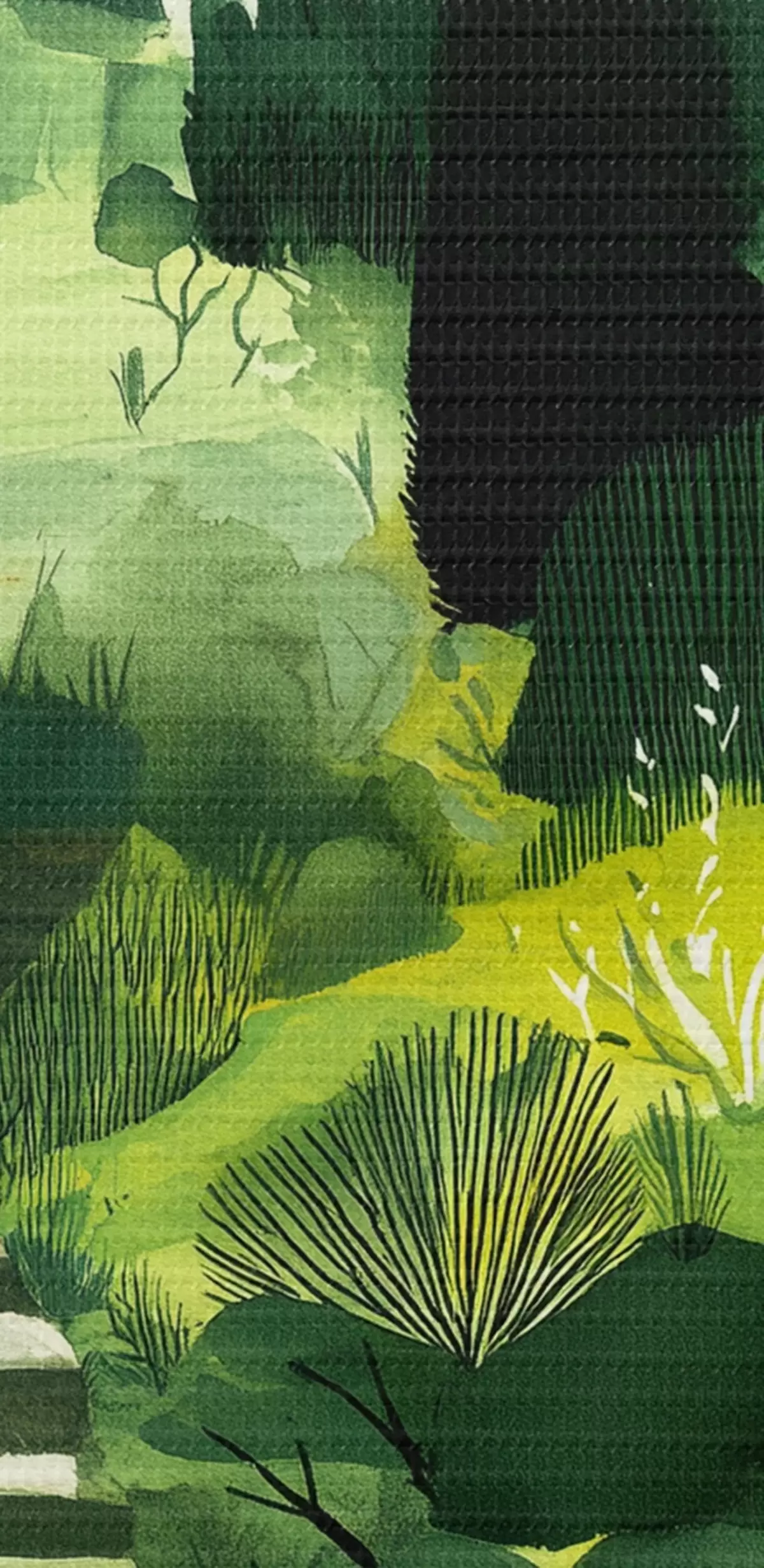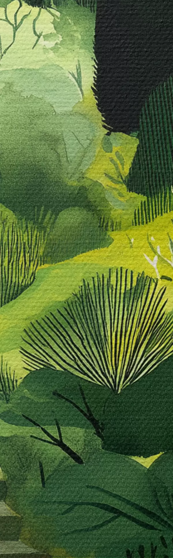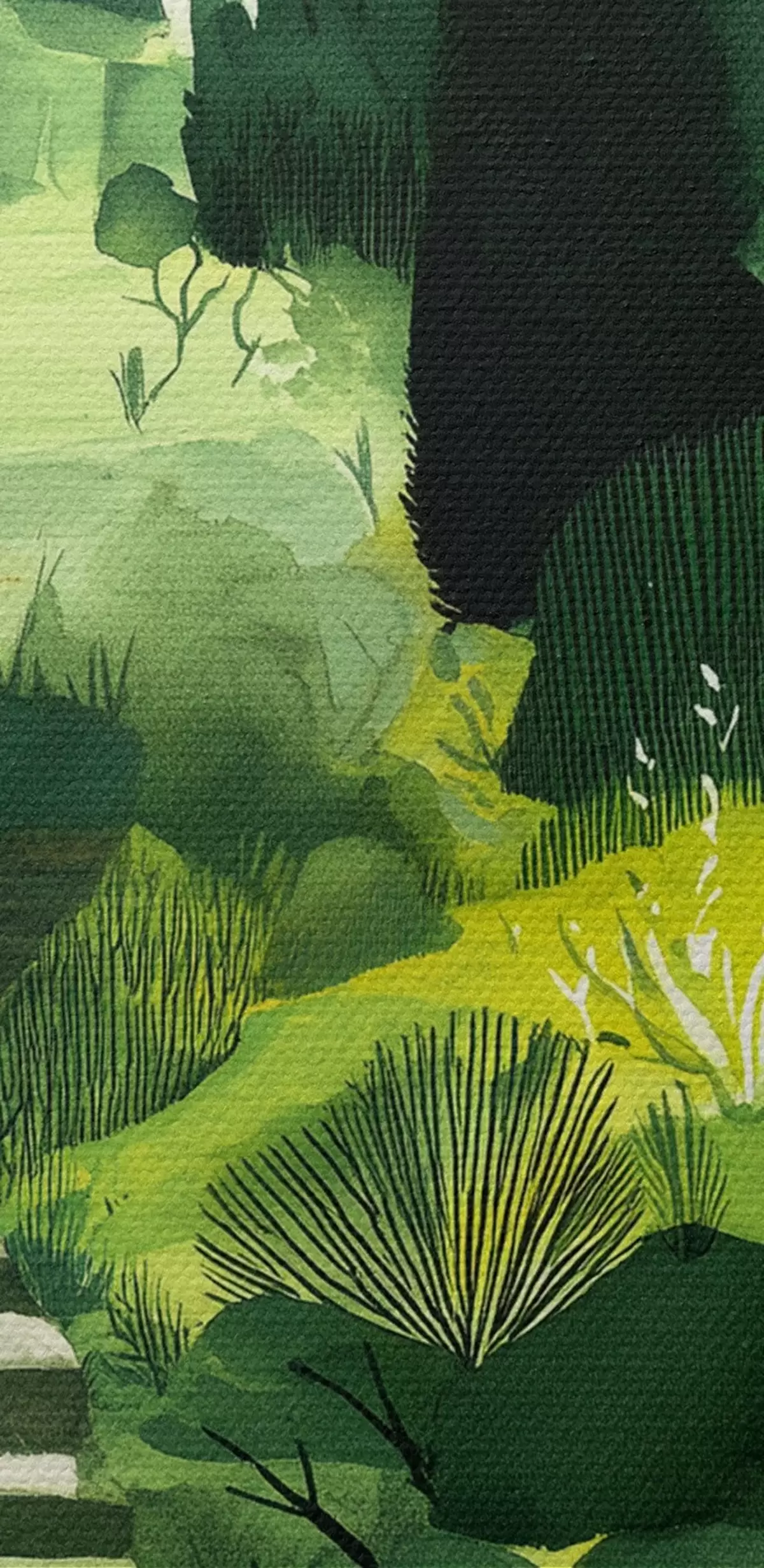 Ronde schilderijen Groene heuvels met bomen en struiken, betonnen trappen, weelderige kleuren r44980