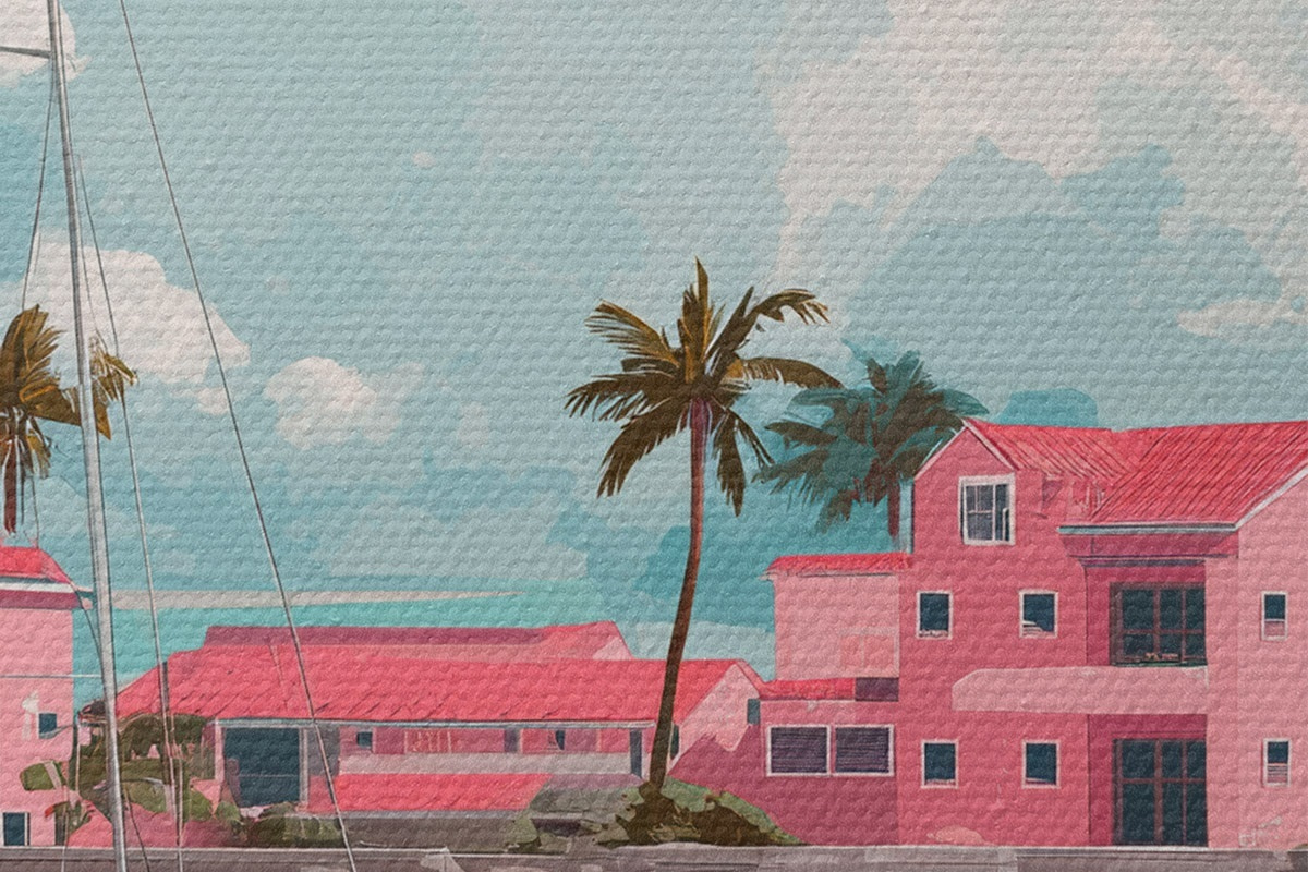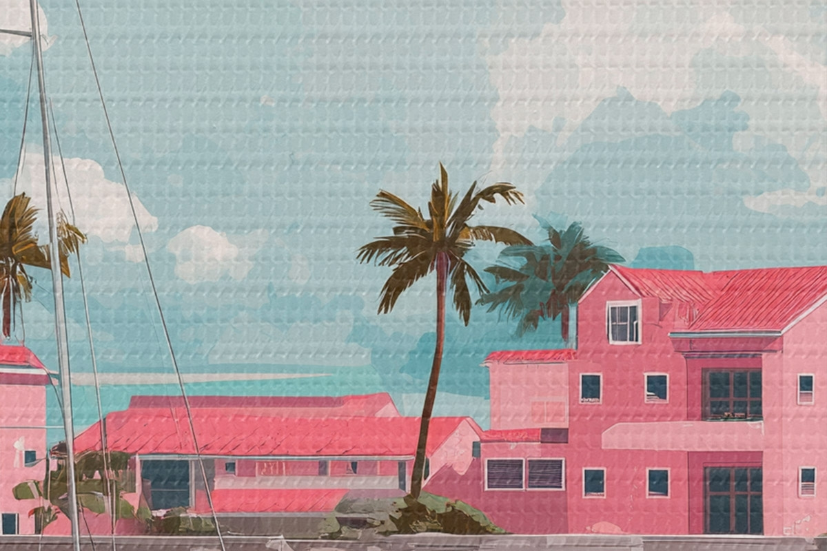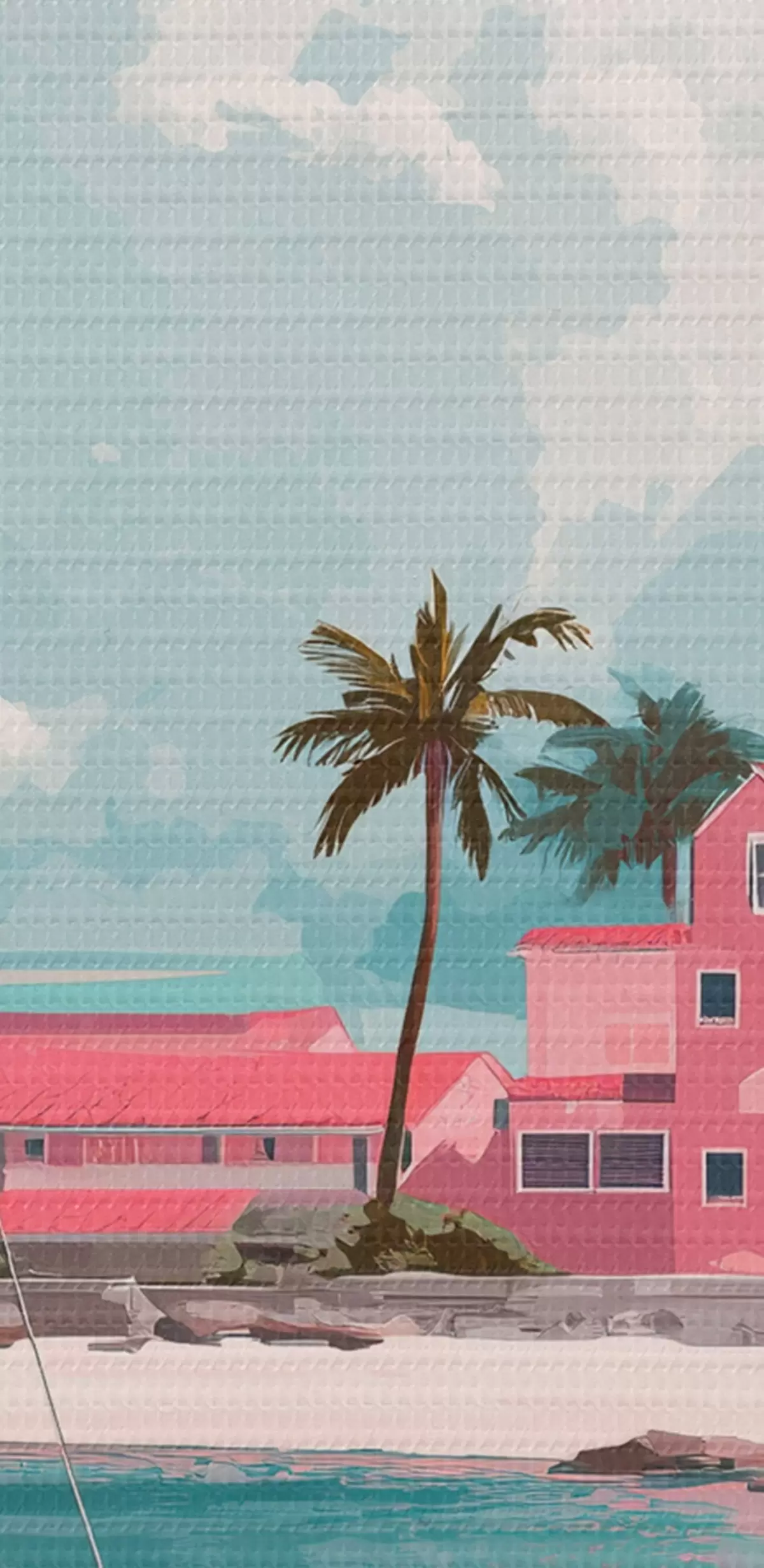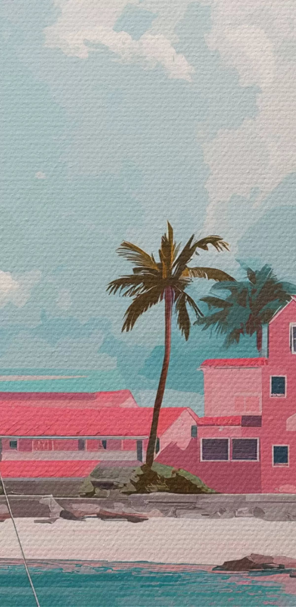 Ronde schilderijen Roze strand met felle zon, zeilboot en huizen Nr r44986