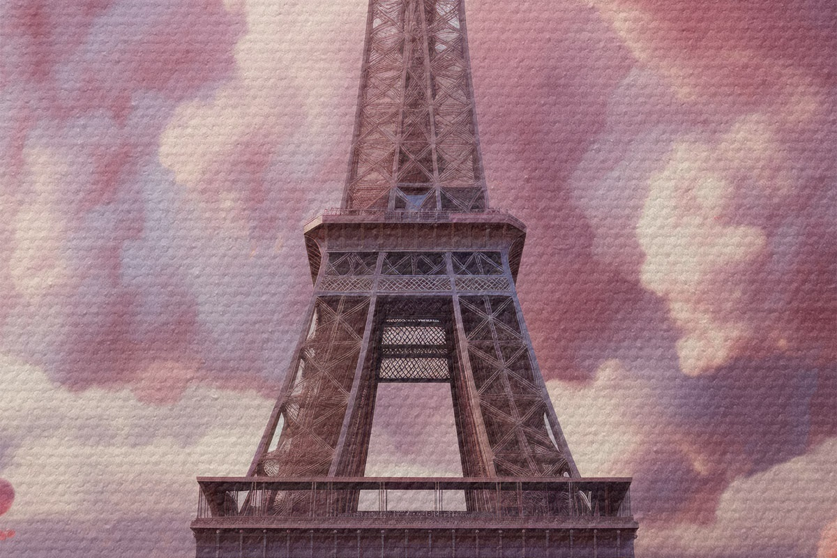 Ronde schilderijen Eiffeltoren in roze wolken in fantasiestijl r45036