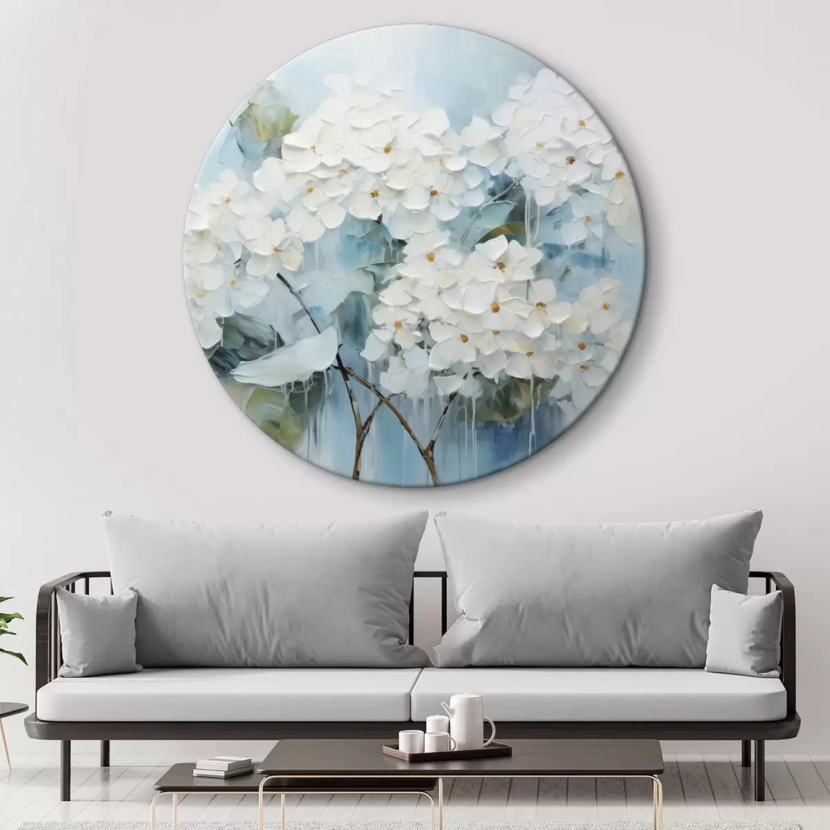Ronde schilderijen Bloeiende witte hortensia's in olieverfschilderijstijl r45051