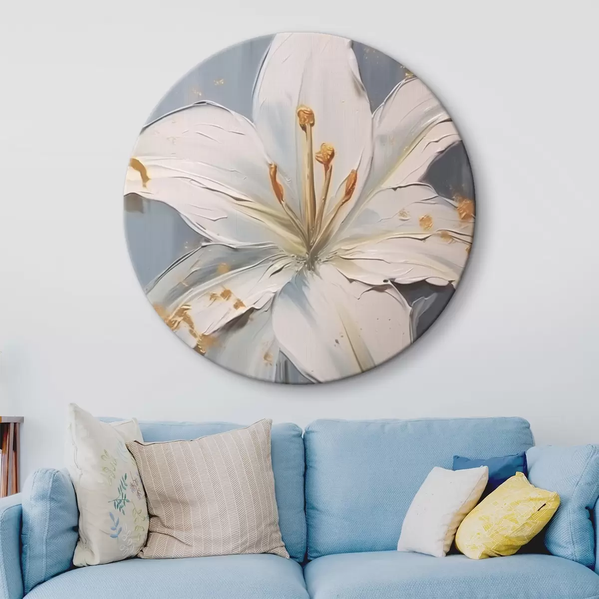 Ronde schilderijen Witte lelie met gele accenten op blauwe achtergrond Nr r45078