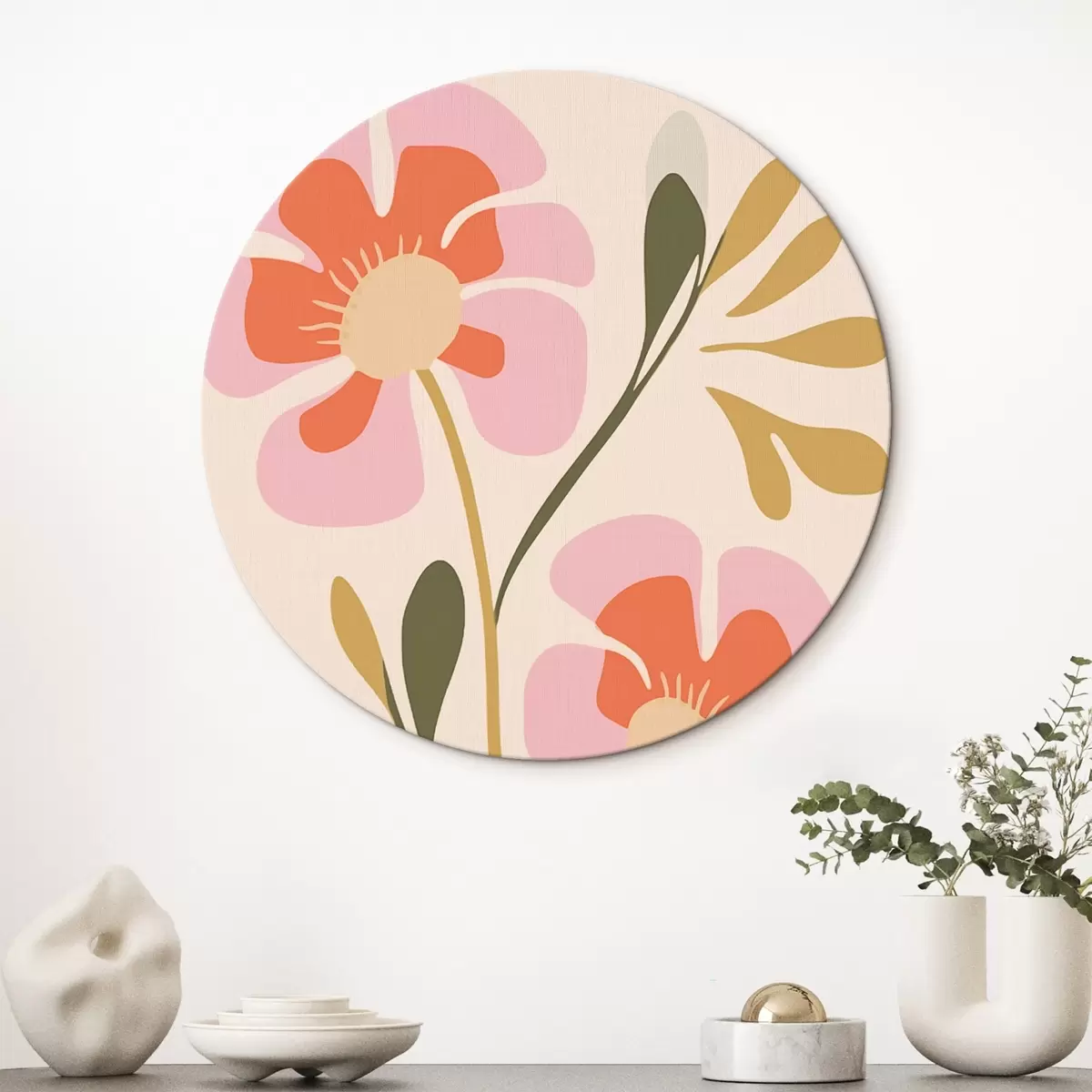 Ronde schilderijen Gestileerde roze en oranje bloemen met groene bladeren Nr r45140