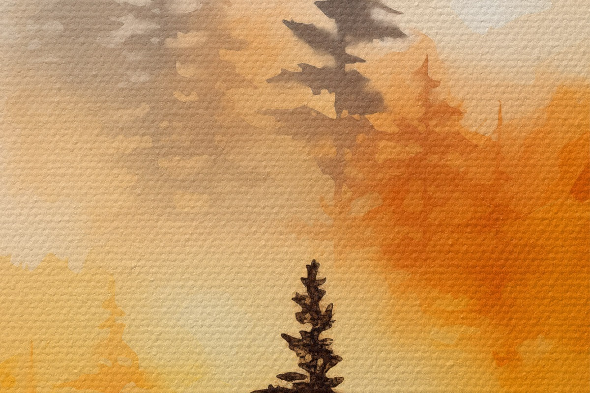 Ronde schilderijen Een landschap aquarel imitatie van een bos met hoge pijnbomen en bergen op de achtergrond Nr r45170